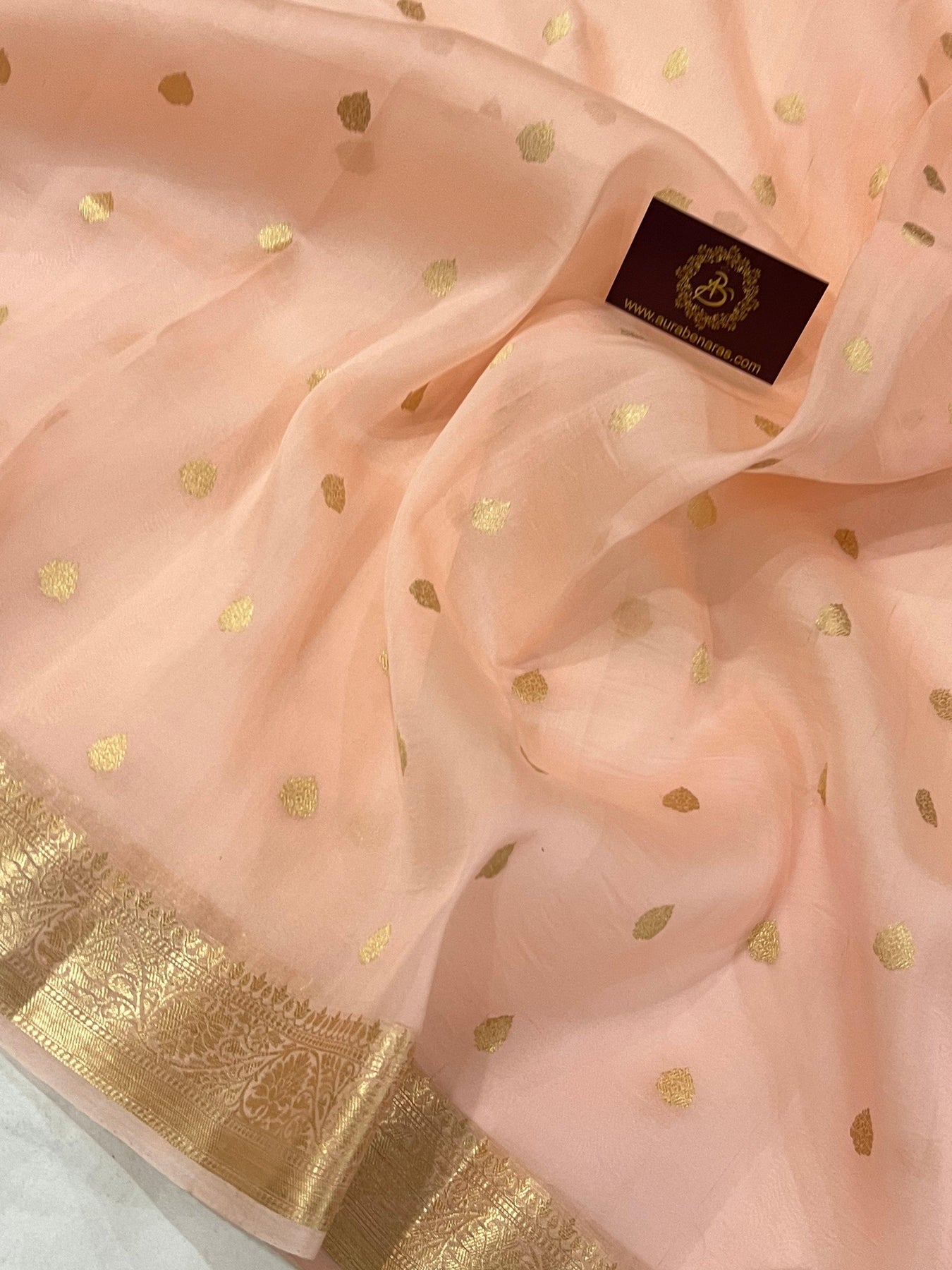 Pani Peach Banarasi Handloom Kora Silk Saree