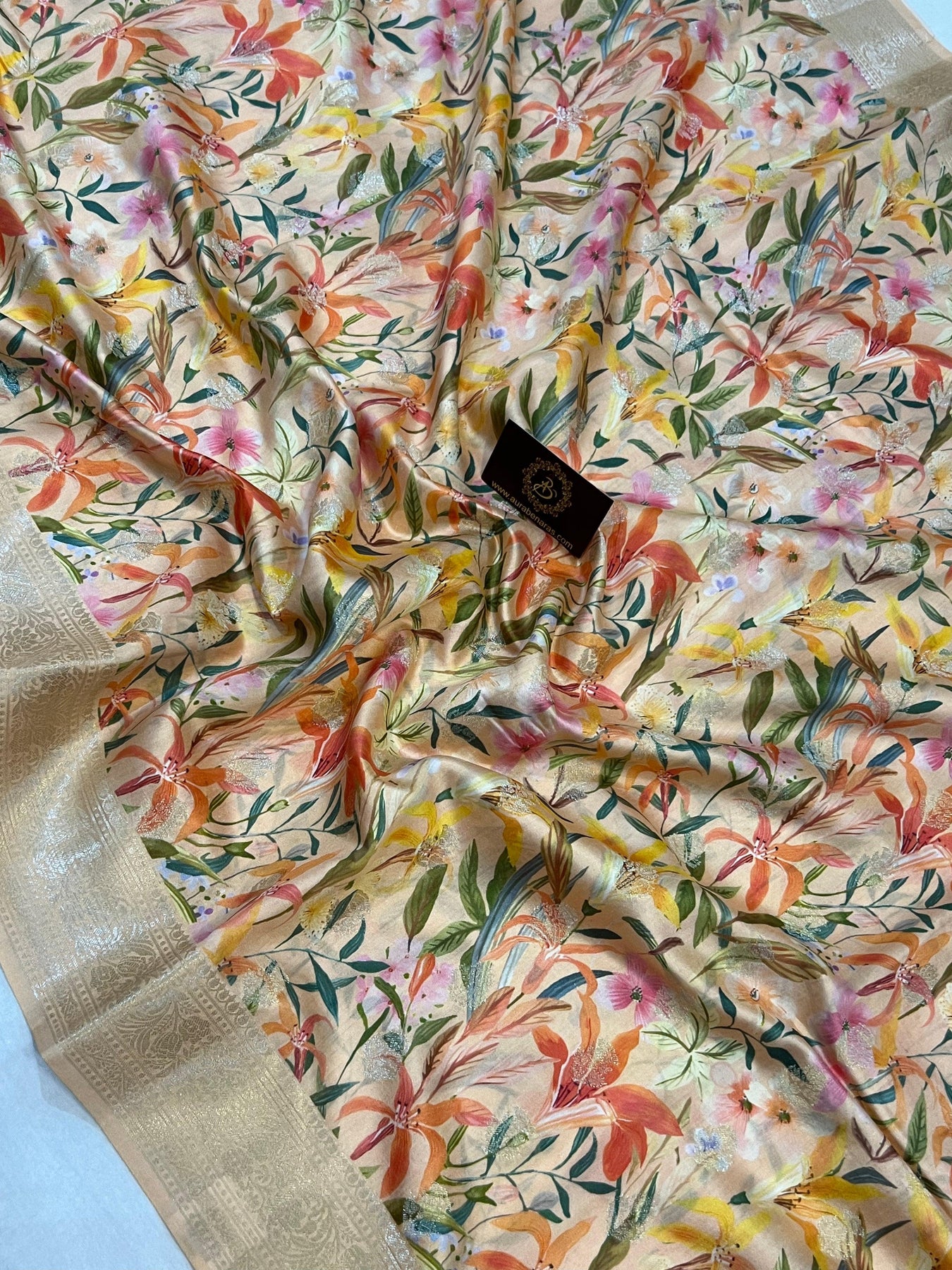 This pure Banarasi handloom Chiniya silk saree features a vibrant digital print in multiple colors, creating a modern yet traditional appeal. The saree is beautifully bordered with a classic Banarasi design, adding an elegant touch. The blouse piece complements the saree with a charming floral print, enhancing the overall aesthetic. The fusion of rich Chiniya silk, striking digital patterns, and the timeless Banarasi border makes this saree perfect for those looking for a blend of contemporary style and traditional craftsmanship..
