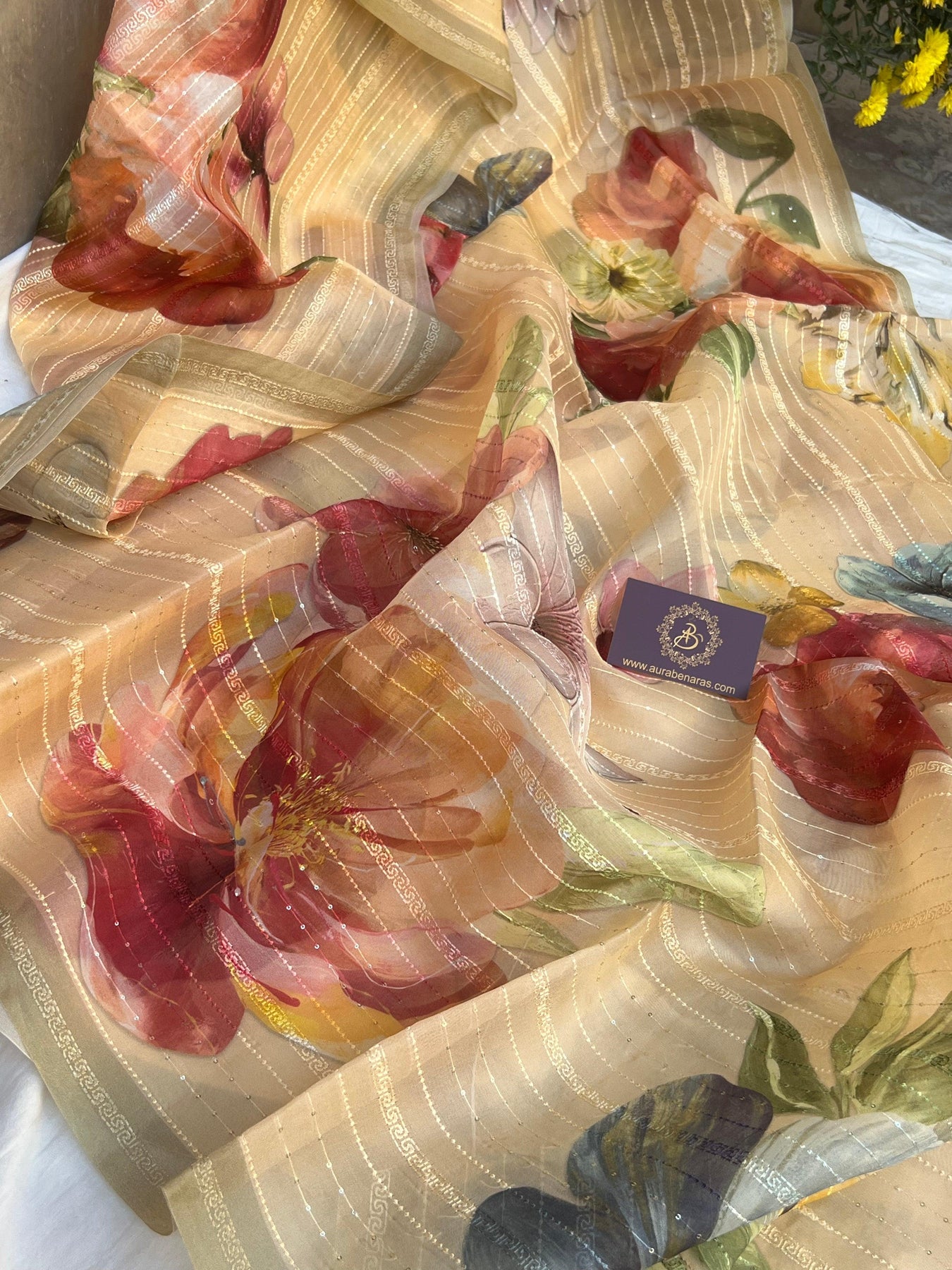 This stunning Banarasi Kora silk saree combines timeless elegance with a touch of contemporary flair. The Kora silk fabric is light, breathable, and luxurious, creating a delicate yet rich look. The saree is adorned with digital print work that infuses a fresh, modern feel into the traditional Banarasi style. The prints are vivid and intricate, featuring beautiful patterns that seamlessly blend with the luxurious texture of the silk.