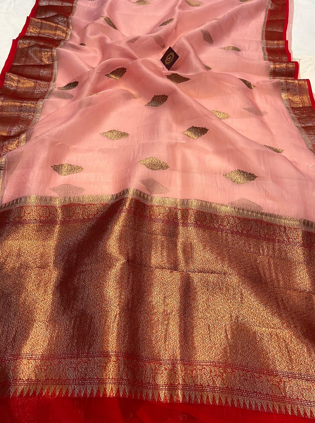 An amazing Handwoven Kora Silk in a Peach color to take your breath away. This vintage piece has allover Kadwa(Kadhua) motifs in antique zari. This handmade treasure exemplifies the Craftsmanship of our Weavers, who have kept the art alive by passing the knowledge from generation to generation. It takes around 15-20 days for artisans to weave one.