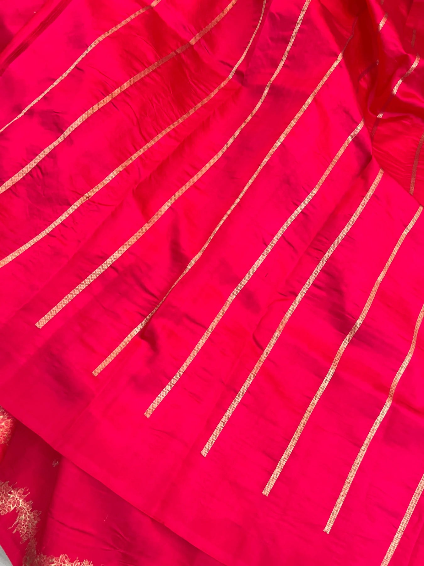 Grace meets grandeur in this stunning orangish pink pure Banarasi silk saree, handcrafted with timeless elegance. Woven in the heart of Varanasi, this saree features delicate Kadhwa butis—individually handwoven golden zari motifs that float gracefully across the body. The Kadhwa technique ensures no loose threads at the back, giving a refined and rich finish.