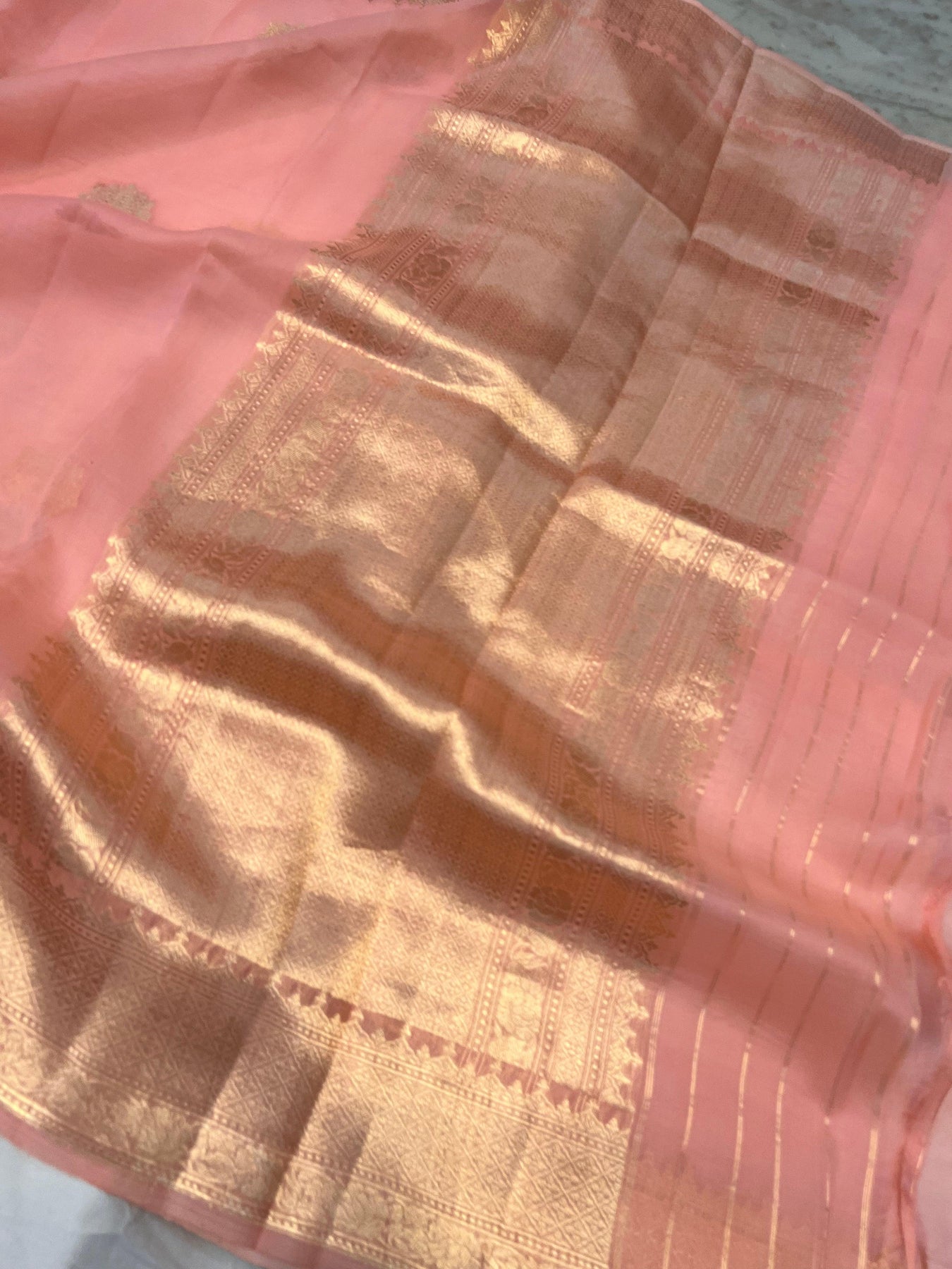 Peach Pure Banarasi Handloom Kora Silk Saree