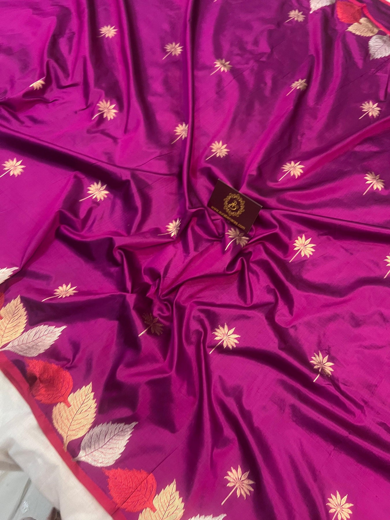 The border of the saree is a masterpiece in itself, adorned with lovely leaf motifs that are accentuated by three different colors of meenakari work. This vibrant detailing adds depth and dimension, enhancing the saree's overall elegance.