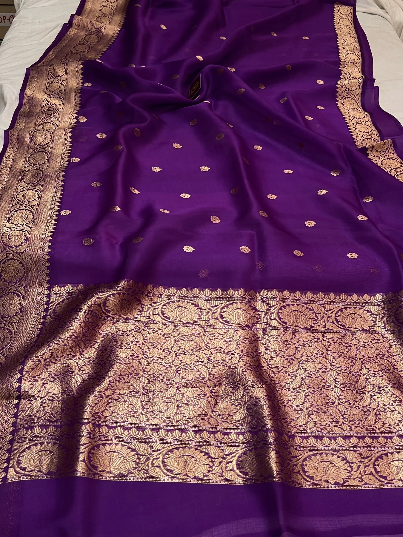 Discover timeless beauty with this Purple Pure Kora Silk Handloom Banarasi Saree, a stunning vintage-inspired masterpiece crafted with extraordinary skill. The saree features allover Kadhwa (Kadhua) motifs woven in rich golden zari, creating a luxurious texture and radiant shimmer that highlights the charm of pure Banarasi craftsmanship.