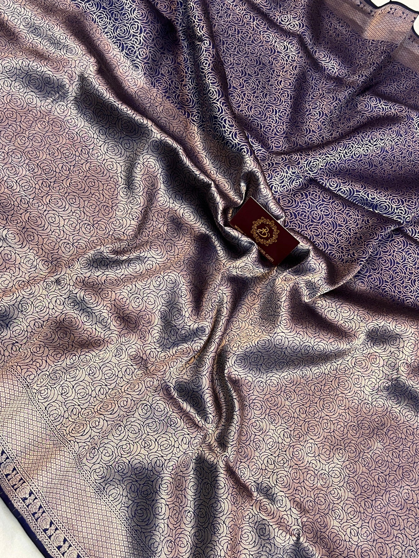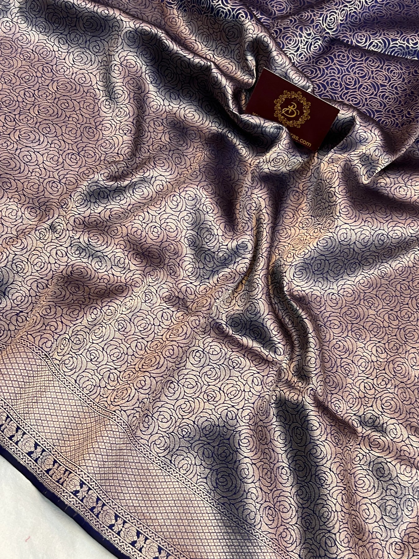 Experience the timeless elegance of this Purple pure Katan silk handloom Banarasi saree, featuring exquisite allover brocade work that seamlessly blends classic charm with modern simplicity. The saree is adorned with a lovely floral design in the lower half, while the upper half has outline of the floral design, creating a balanced and sophisticated look. A traditional Banarasi border woven with golden zari frames the saree beautifully, adding an extra touch of luxury and heritage. Paired with a plain blouse piece, this versatile and elegant saree is perfect for weddings, festivals, and grand celebrations, reflecting the rich legacy of Banarasi craftsmanship.