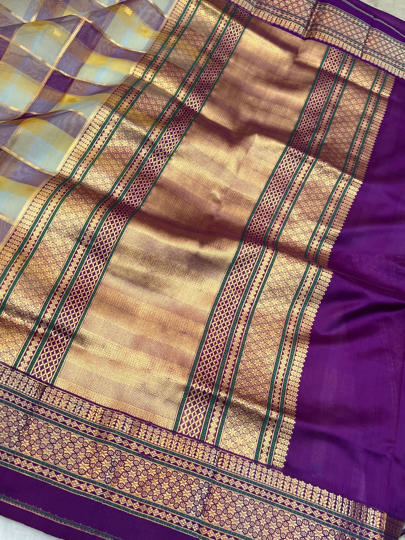 Gracefully blending tradition with vibrant artistry, this Purple Pure Kora Silk Handloom Banarasi Saree is a true celebration of fine craftsmanship. Woven from sheer, lightweight pure kora silk, the saree features an elegant checks pattern, with each check adorned by a delicate kadhwa buti—handwoven in nine different colors using the age-old kadhwa technique.