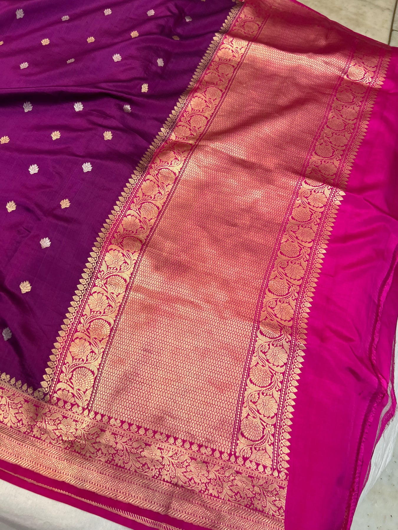 Drape yourself in timeless elegance with this luxurious purple pure Banarasi silk saree, masterfully handwoven in Varanasi. The rich silk base is adorned with intricate Kadhwa butis—a hallmark of fine Banarasi craftsmanship—meticulously woven using both golden and silver zari threads. These delicate motifs shimmer beautifully, creating a regal contrast against the deep purple backdrop.