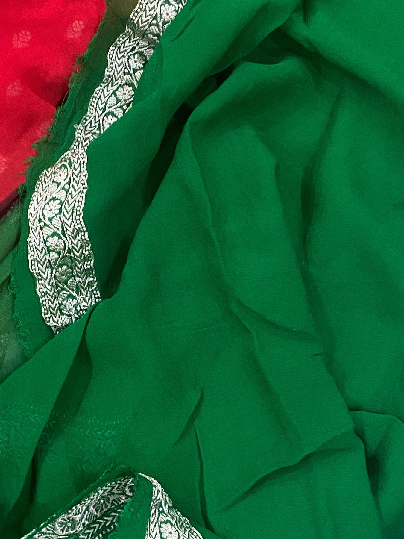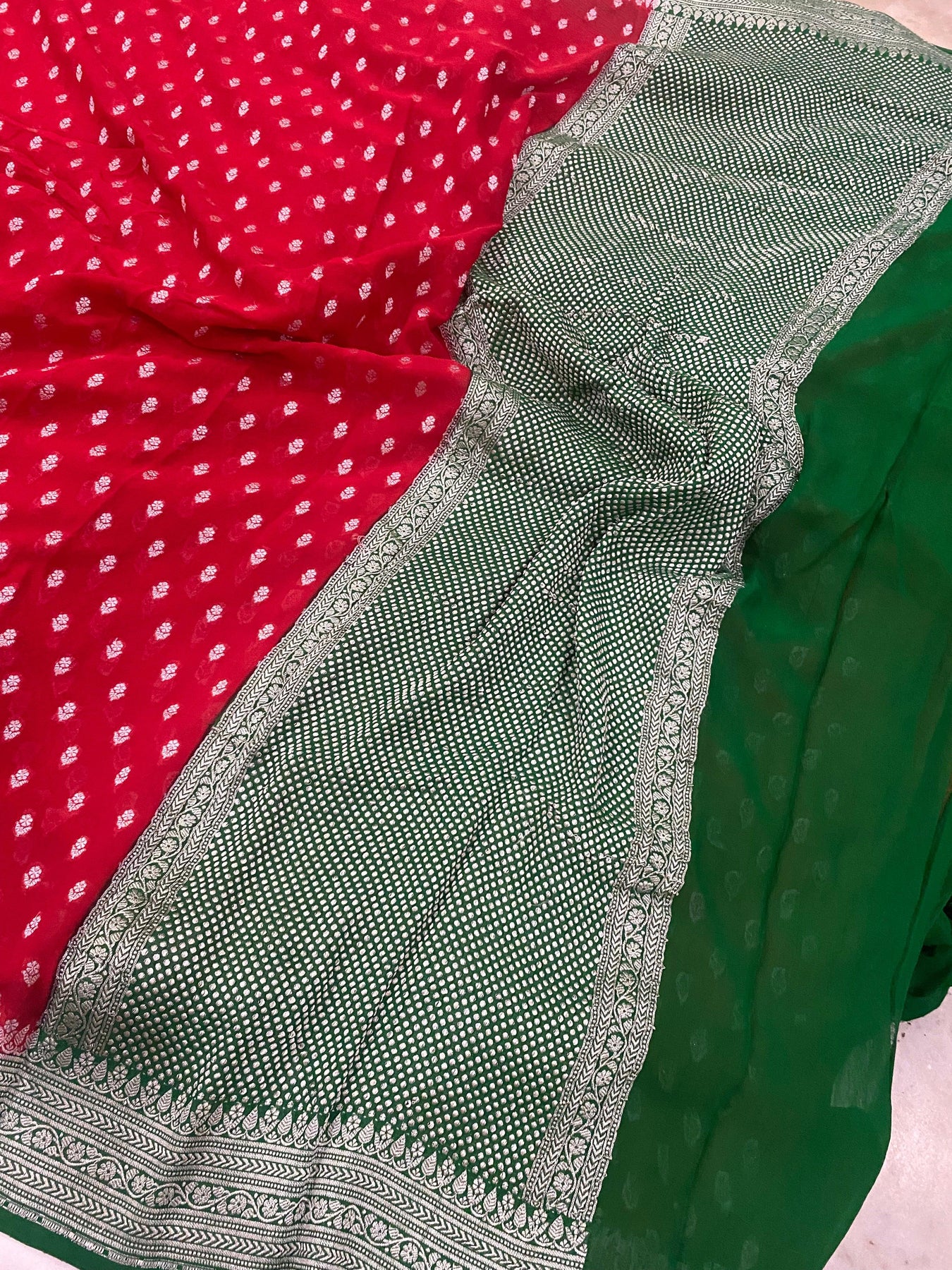Indulge yourself with the elegance of Banaras with this Red saree. The minute buti design in silver zari design with designer border over the red saree and the edges, gives the royal look to you & make you shine with richness and love at every occasion.