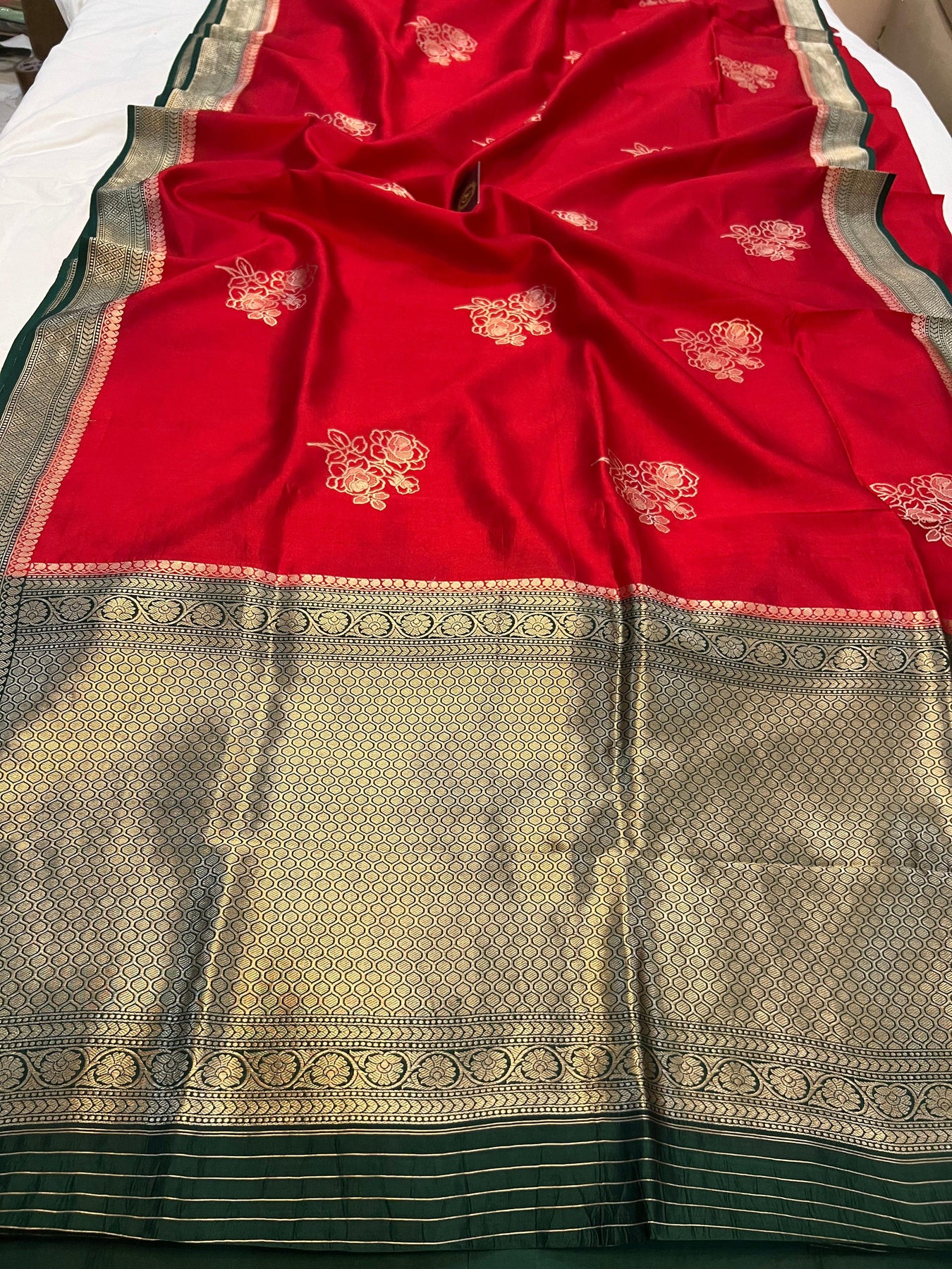 The pure Banarasi Katan silk saree is a breathtaking showcase of traditional craftsmanship and elegance. Crafted with a rich texture, this saree features exquisite kadhwa weaving that highlights its luxurious appeal. The focal point of the saree is its large floral motifs, intricately woven in radiant golden zari, creating a stunning contrast against the rich fabric. These motifs exude opulence, making the saree perfect for special occasions.