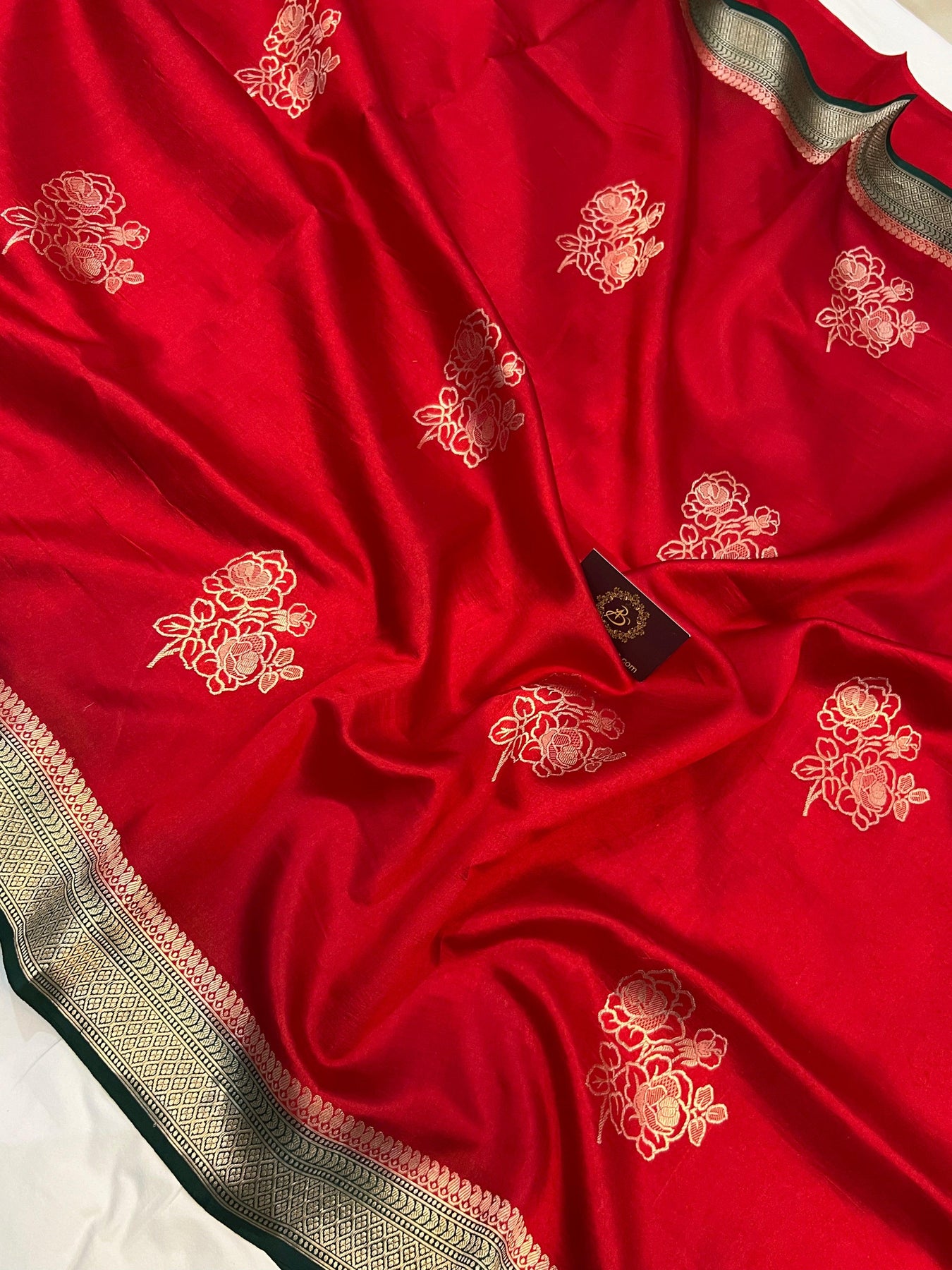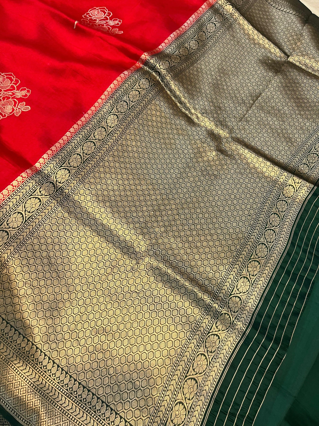 The lovely kadhwa Banarasi border enhances the overall design, showcasing detailed patterns that echo the beauty of the floral elements. This border adds a touch of grandeur, framing the saree beautifully. The accompanying blouse piece is elegantly plain, allowing the saree to take center stage, yet it features a matching border that ties the look together seamlessly.