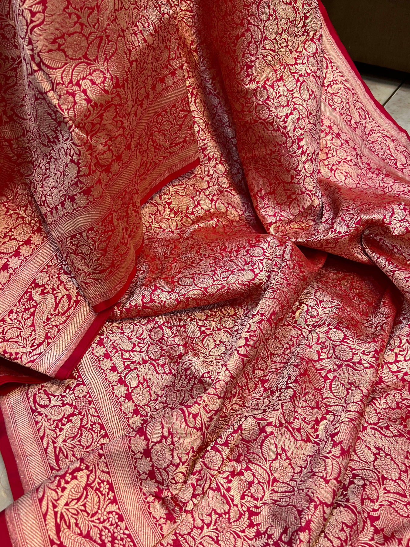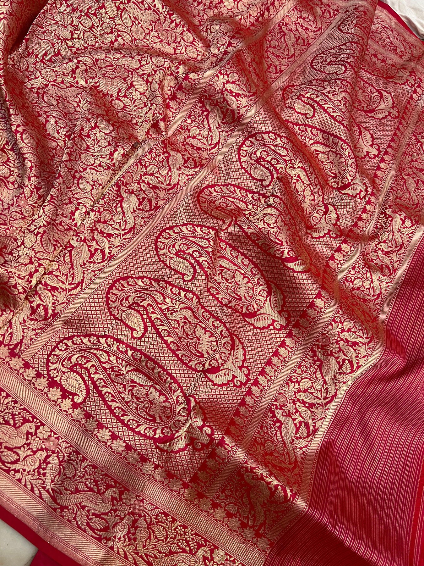 Reddish Pink Pure Katan Silk Banarasi Handloom Saree with Shikargaah Design