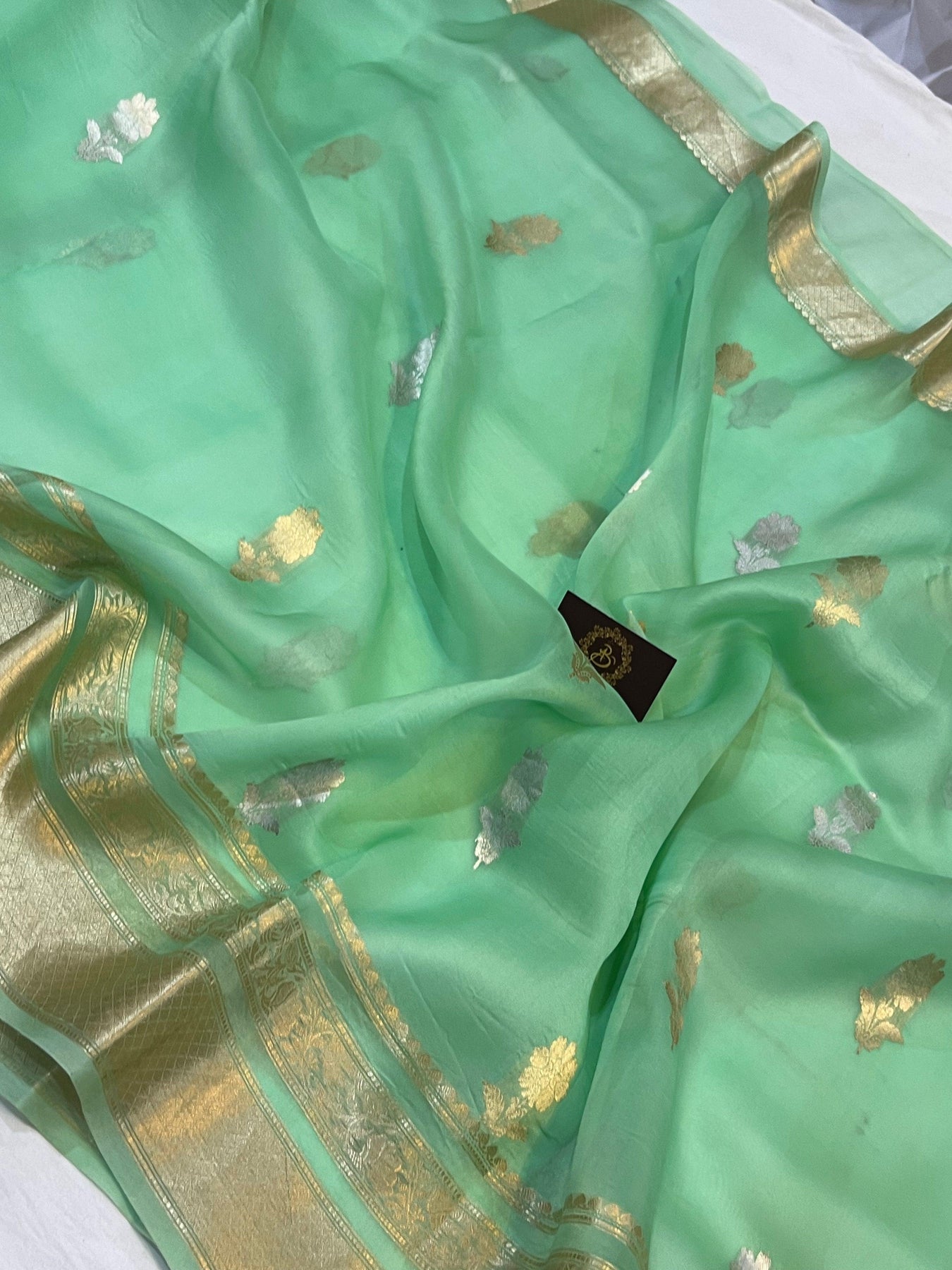 Sea Green Pure Banarasi Handloom Kora Silk Saree