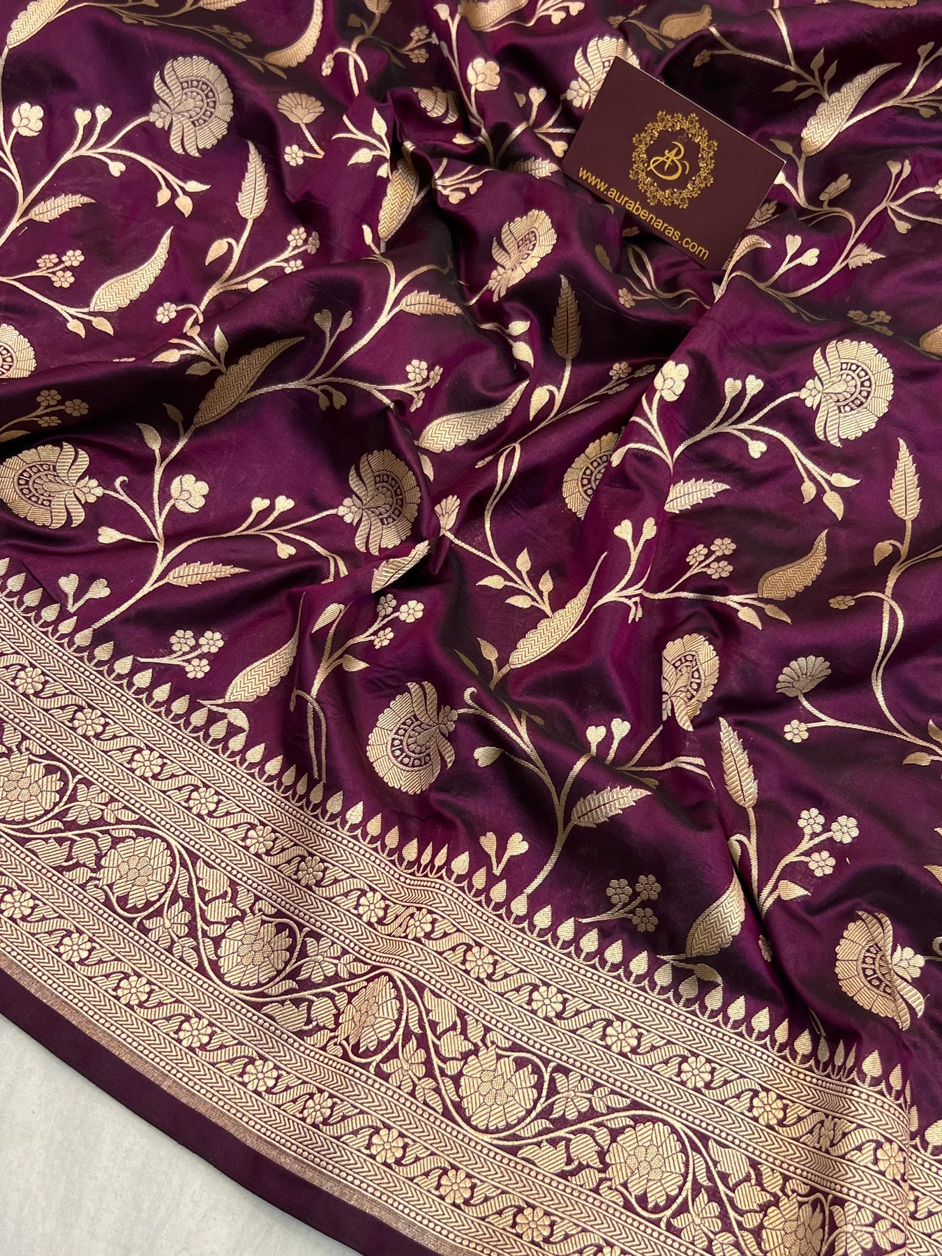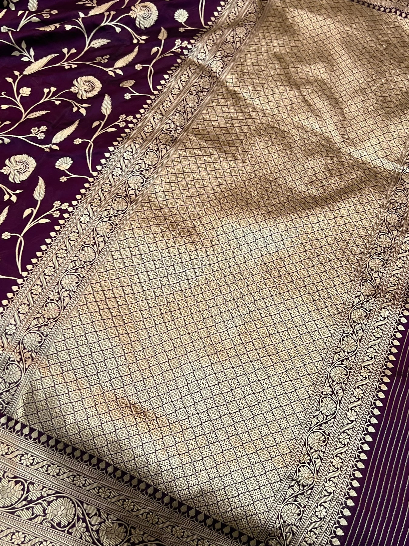 Discover the timeless beauty of this WIne pure Katan silk handloom Banarasi saree, adorned with an exquisite floral jaal pattern woven in shimmering light golden zari. The elegant border and palla perfectly complement the intricate jaal work, creating a harmonious and graceful look that exudes regal charm. The lightweight Katan silk fabric ensures a luxurious drape, making it perfect for festive occasions and grand celebrations. Paired with a plain blouse piece featuring golden zari lines, this classic Banarasi saree seamlessly blends traditional artistry with understated sophistication.