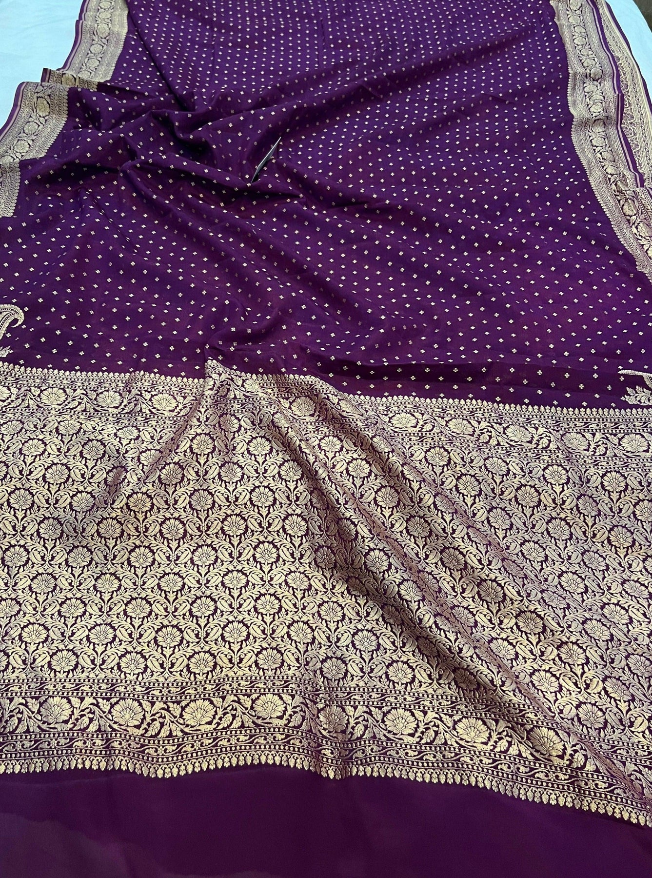 A stunning Wine Banarasi handloom classic. The authentic buti work in golden zari handwoven in the finest chiffon georgettes, comes with a same color heavy jaal work blouse. It takes around 10 days to weave this rich and luxurious piece of our tradition.