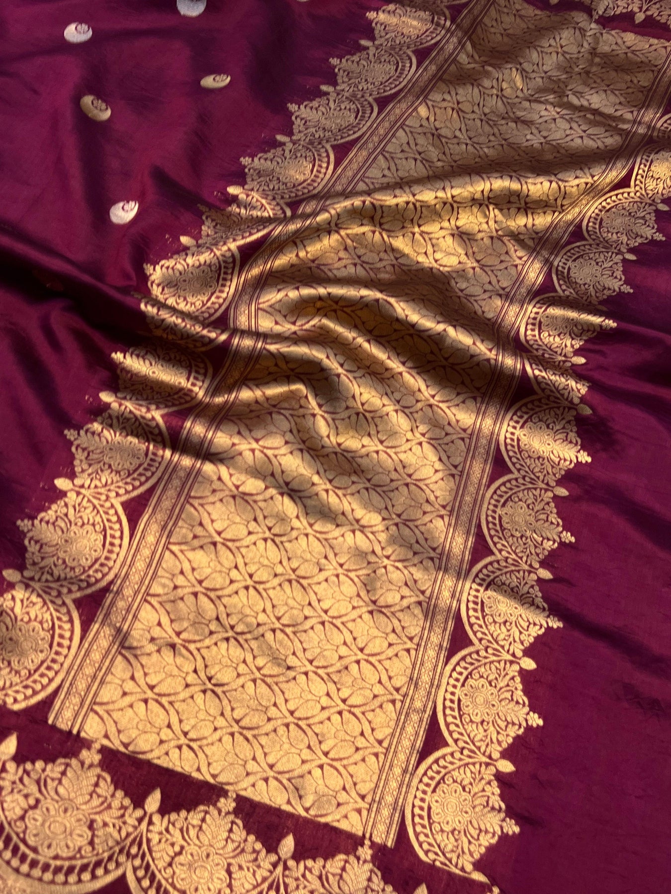 Detailed view of golden zari Kadhwa chand butis on pure silk Banarasi saree.