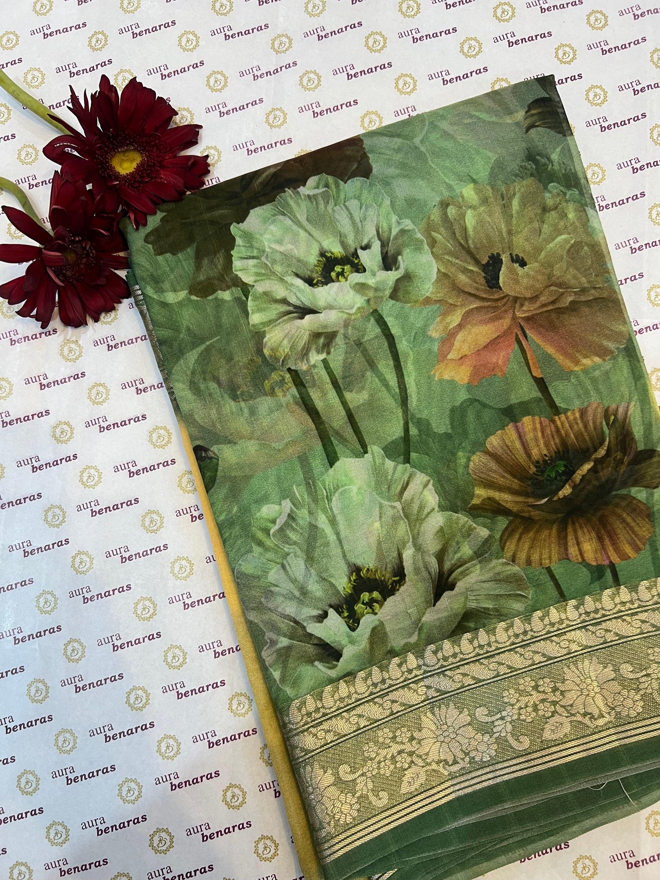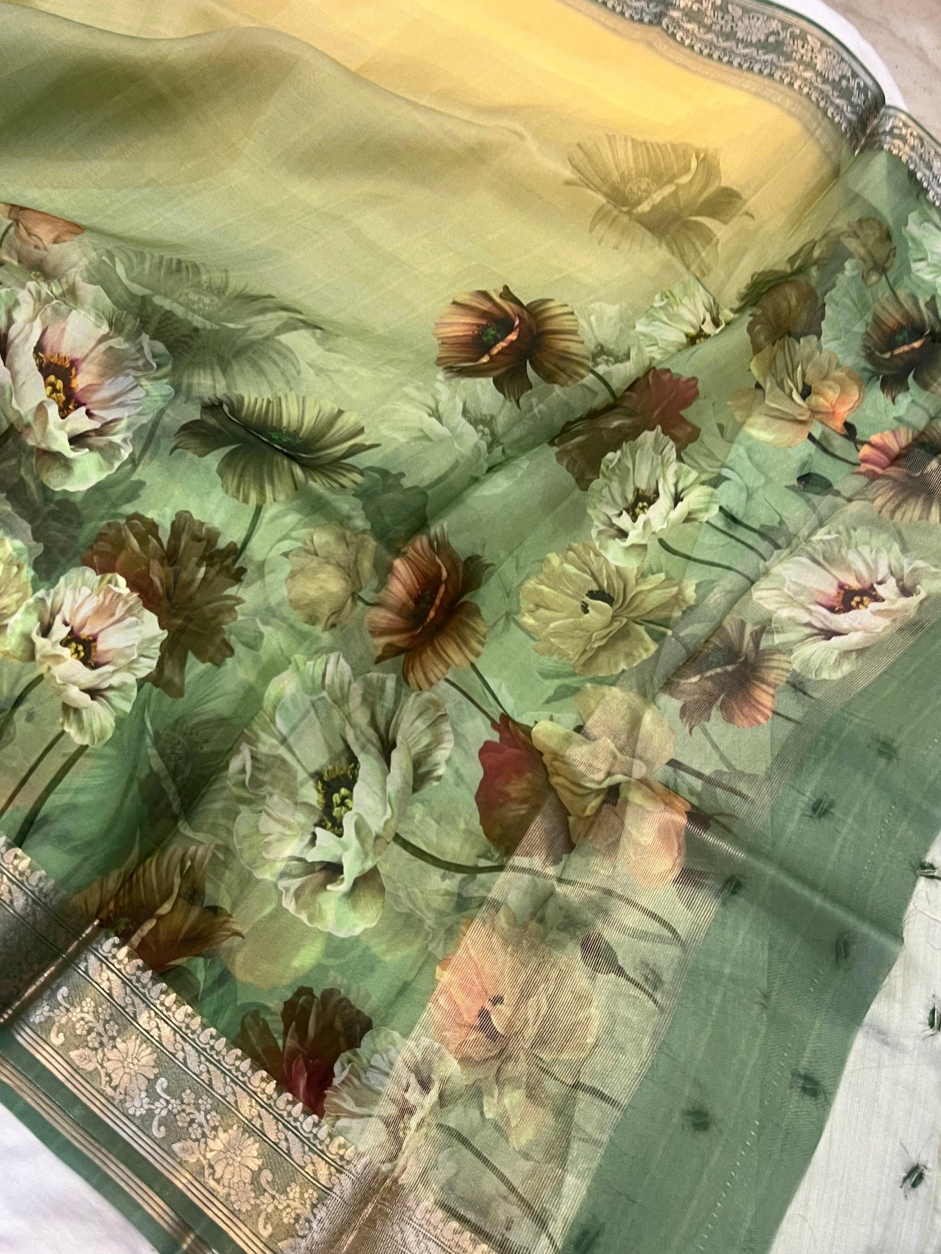 The saree’s Banarasi border is the highlight, offering a rich, traditional touch that perfectly balances the modern digital prints. The border is woven with the signature Banarasi craftsmanship, adding a regal, intricate detail that elevates the entire look. Its shimmering texture and elegant patterns enhance the saree's overall beauty, making it perfect for festive occasions or celebrations.