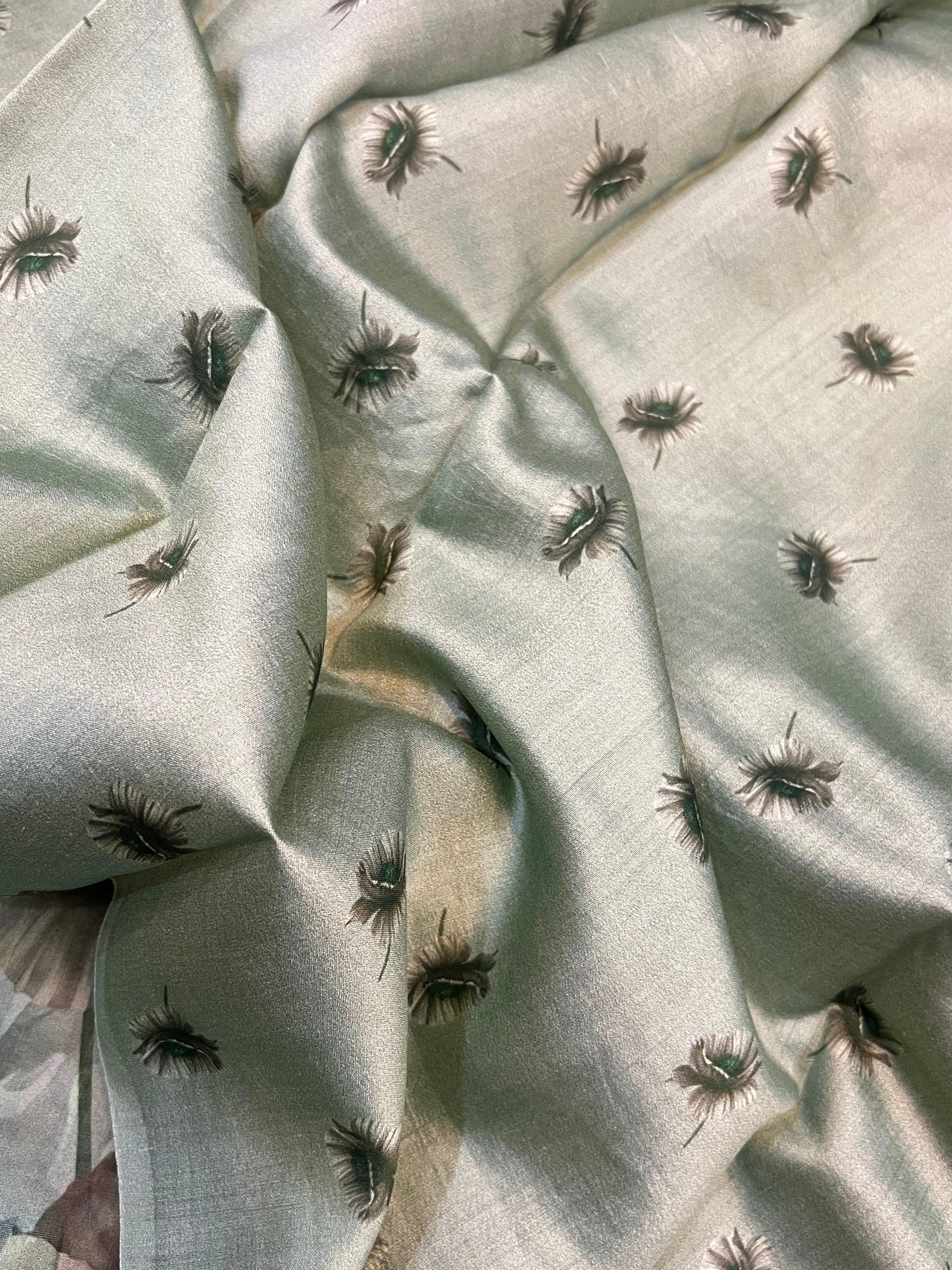The blouse, made from luxurious Chiniya silk, features lovely floral prints that complement the design of the saree.