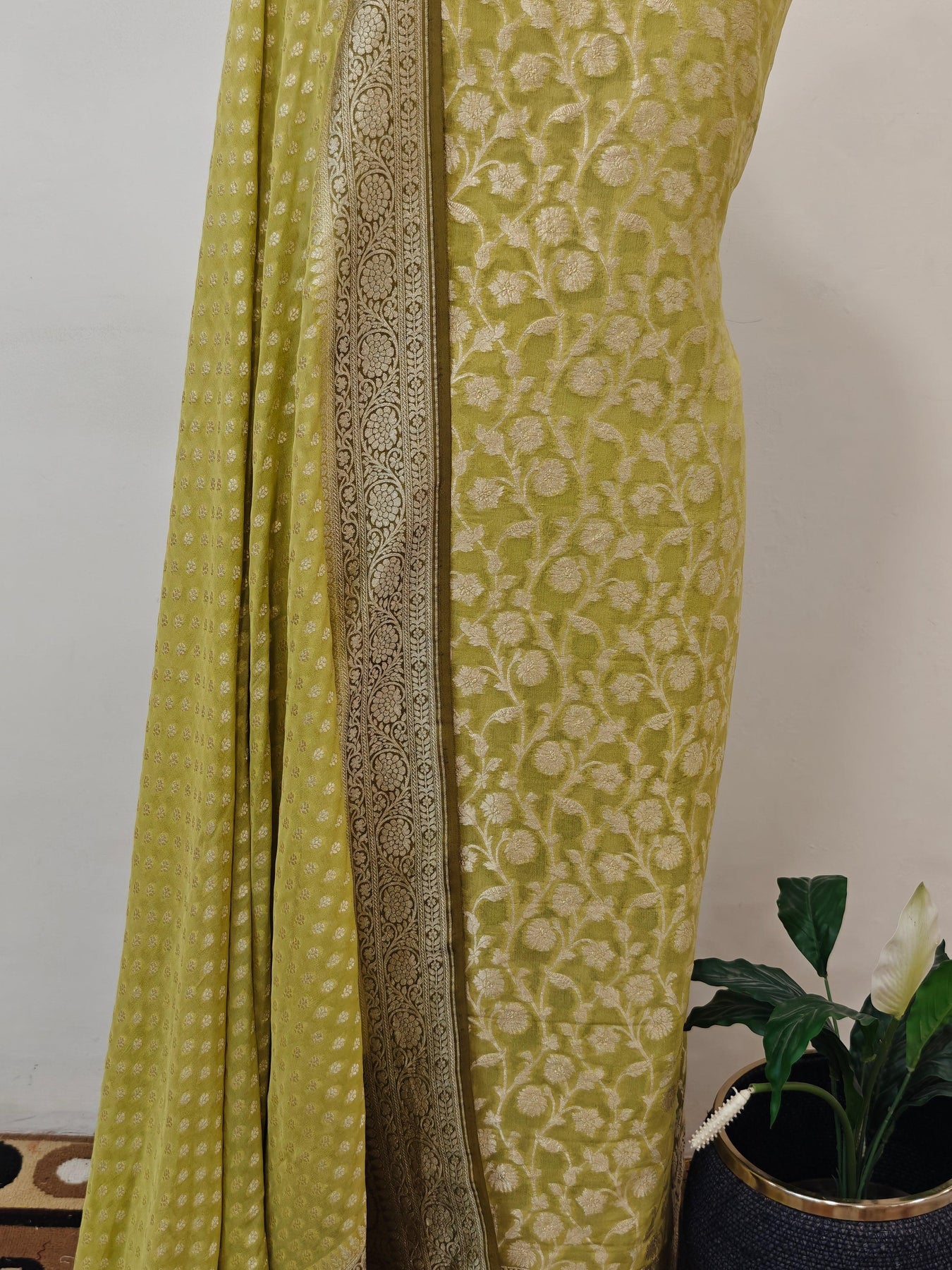 A stunning Parrot Green Banarasi 2 pc Suit. The authentic flower jaal design on the kurta and buti work on the dupatta with light golden zari handwoven in the finest chiffon georgettes. It takes around 4-5 days to weave this rich and luxurious piece of our tradition.