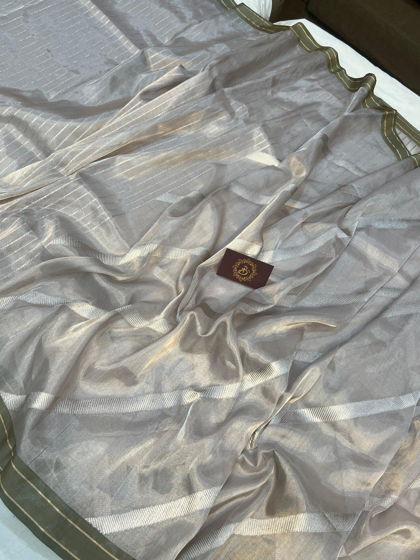 An amazing Handwoven Tissue Silk in a Silver color to take your breath away. This vintage piece has Kadwa(Kadhua) aada design near the pallu side and thin zari lines in the inner portion. It has a contrast mashru silk border with zari lines. This handmade treasure exemplifies the Craftsmanship of our Weavers, who have kept the art alive by passing the knowledge from generation to generation. It takes around 15-20 days for artisans to weave one.