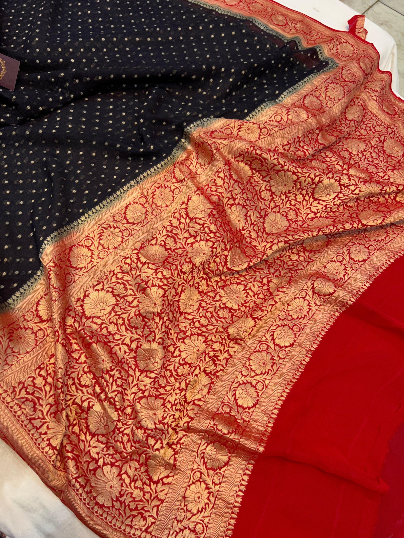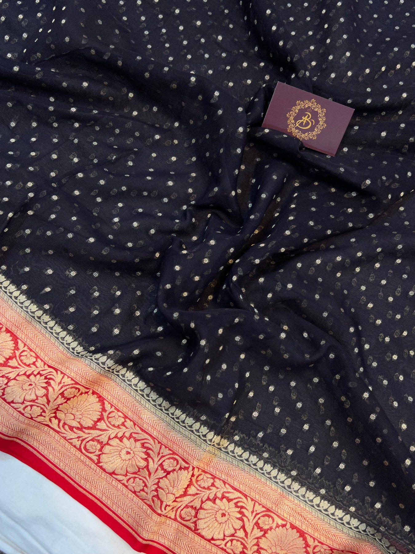 A stunning Black Banarasi handloom classic. The authentic buti work in golden zari handwoven in the finest chiffon georgettes, comes with a contrast plain blouse. It takes around 10 days to weave this rich and luxurious piece of our tradition.