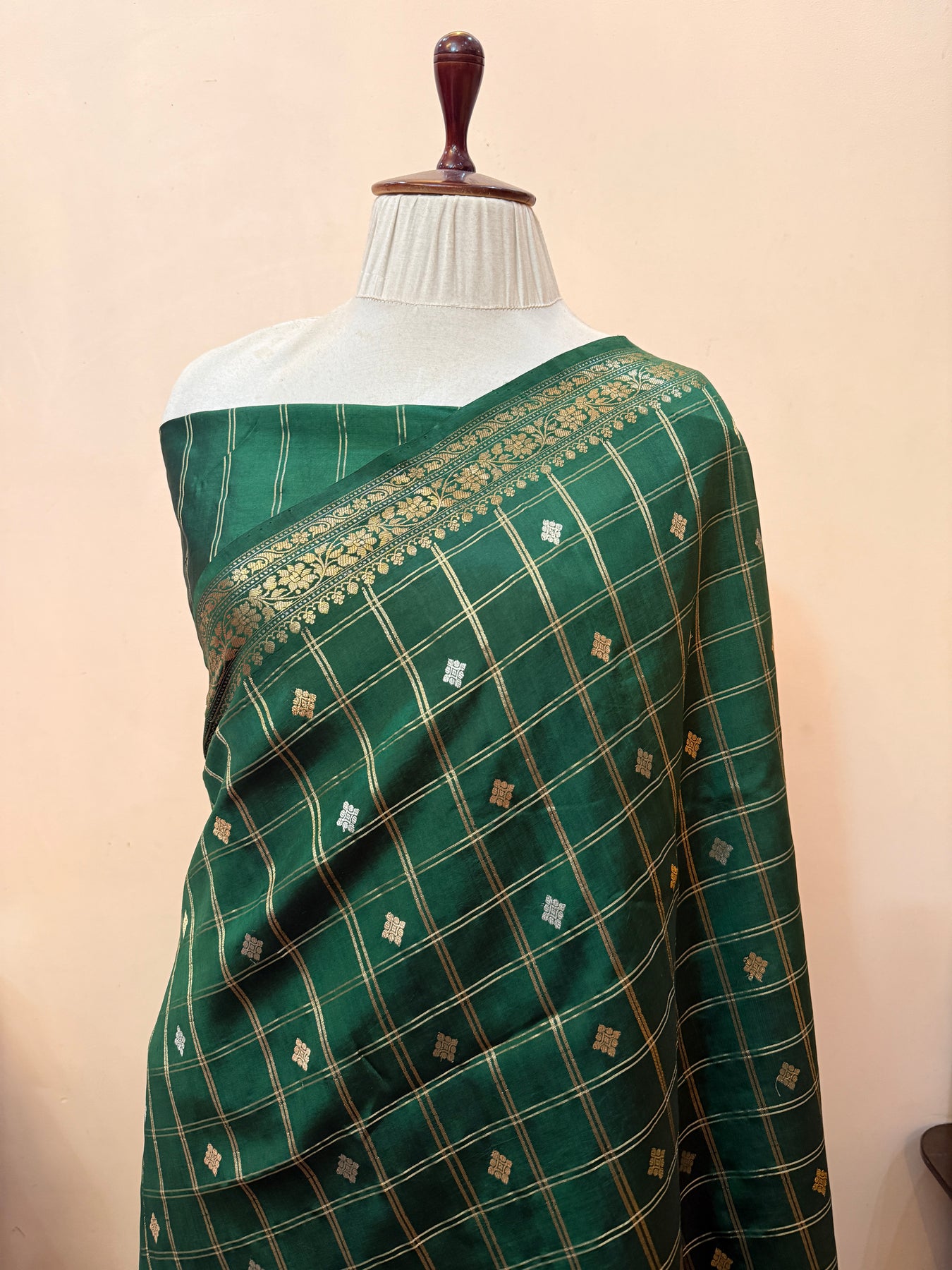 The rich bottle green hue enhances the luxurious sheen of pure silk, while the traditional Banarasi border woven in zari adds depth, grandeur, and a regal finish to the drape. The harmonious combination of structured checks and delicate butis creates a sophisticated visual appeal, making this saree ideal for weddings, festive occasions, and formal celebrations.