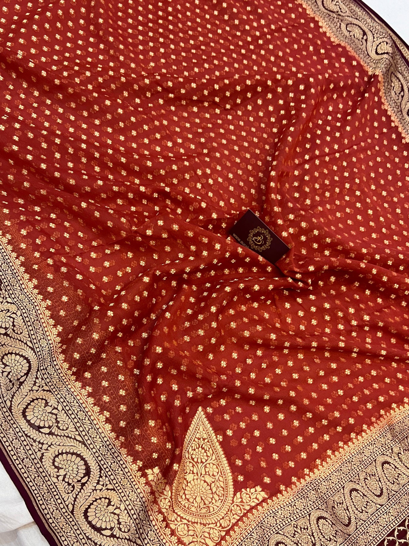 A stunning Rust Orange Banarasi handloom classic. The authentic buti work in golden zari handwoven in the finest chiffon georgettes, comes with a plain blouse. It takes around 10 days to weave this rich and luxurious piece of our tradition.