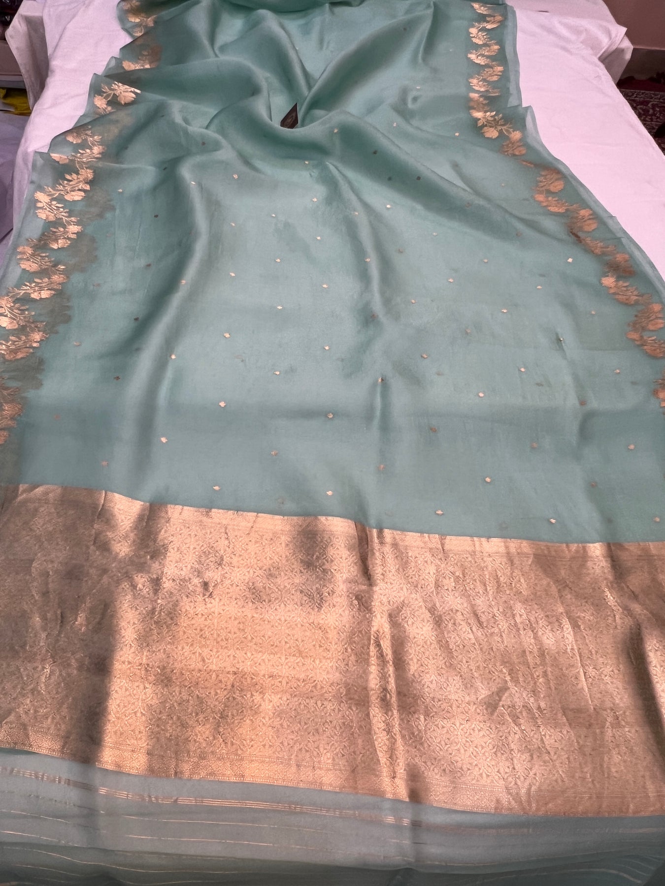 Sage Blue Pure Kora Silk Handloom Banarasi Saree