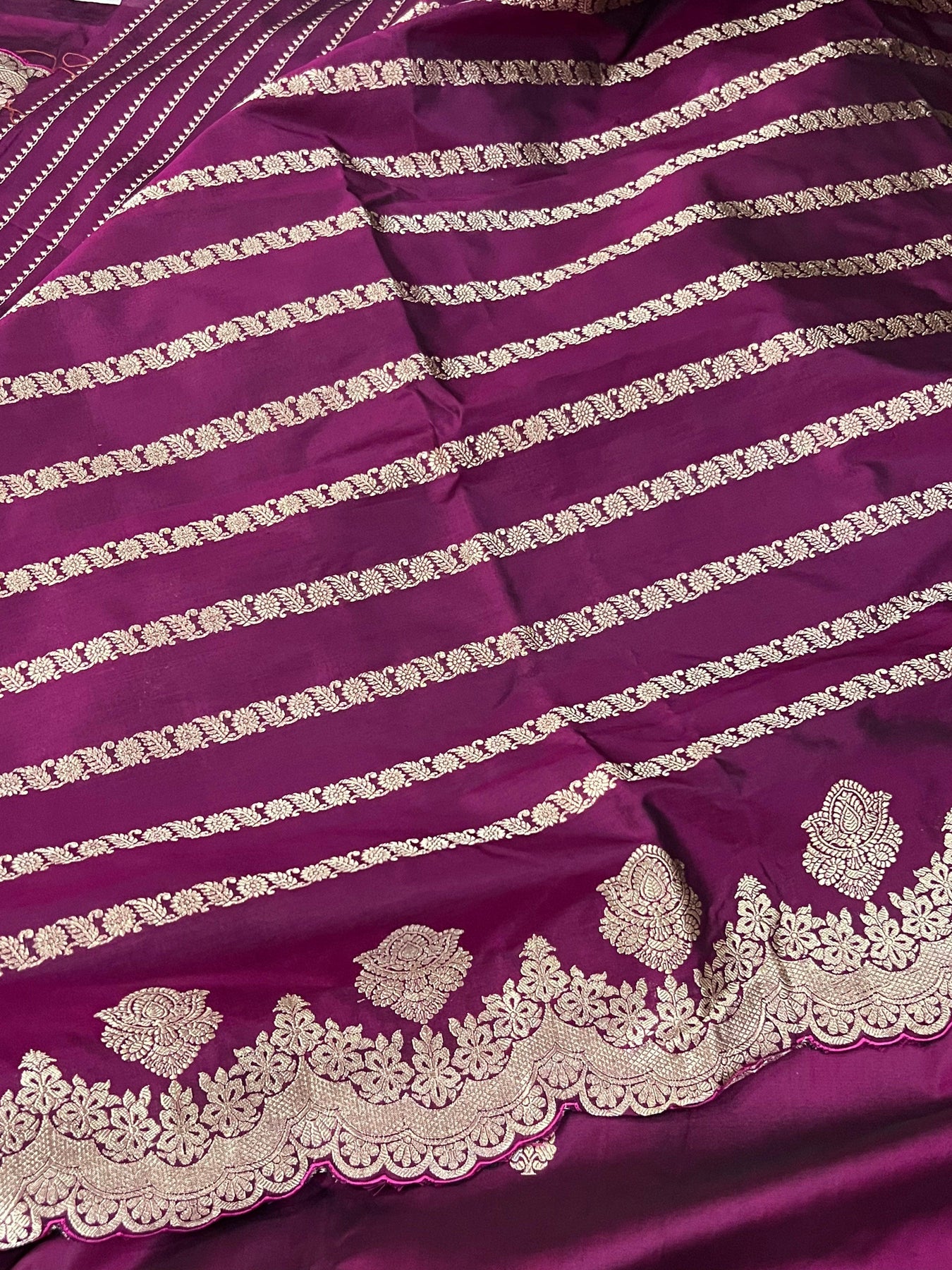 A stunning Wine Banarasi handloom classic with kadhua buti work with designer scallop border. The authentic kadhua buti work in golden zari handwoven in the finest katan silks, comes with a heavy blouse. It takes around 20-25 days to weave this rich and luxurious piece of our tradition.