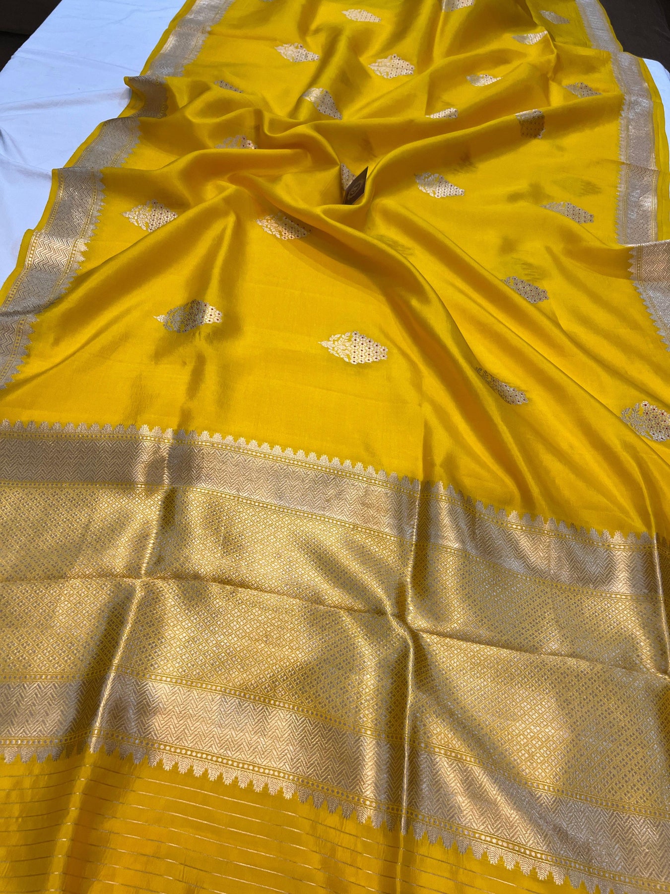 An amazing Handwoven silk saree in a Yellow color to take your breath away. This vintage piece has Kadwa(Kadhua) floral motifs with meenakari work all over the saree. It has a kadhwa banarasi border with golden zari. Blouse piece is plain with border. It takes around 15-20 days for artisans to weave one.