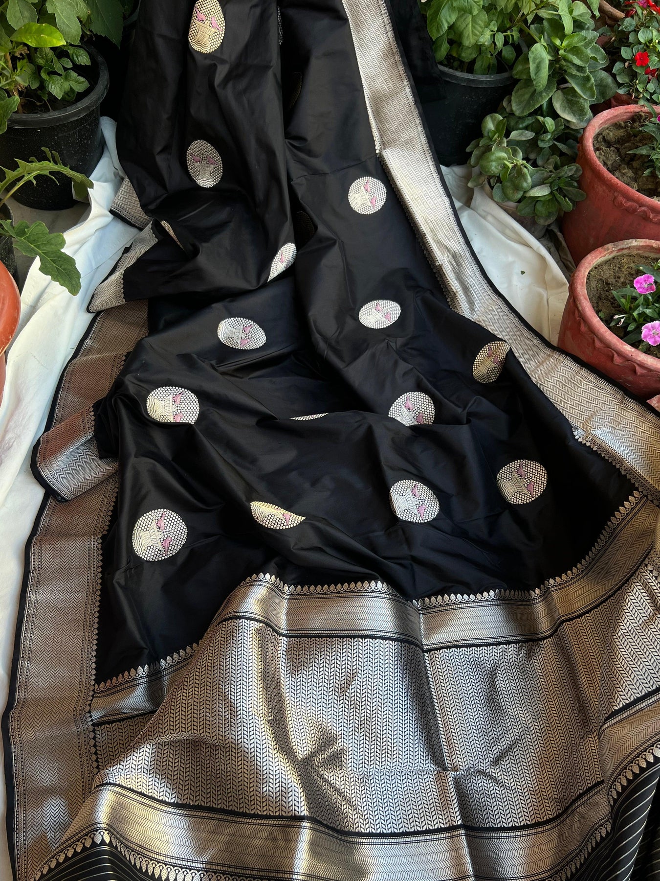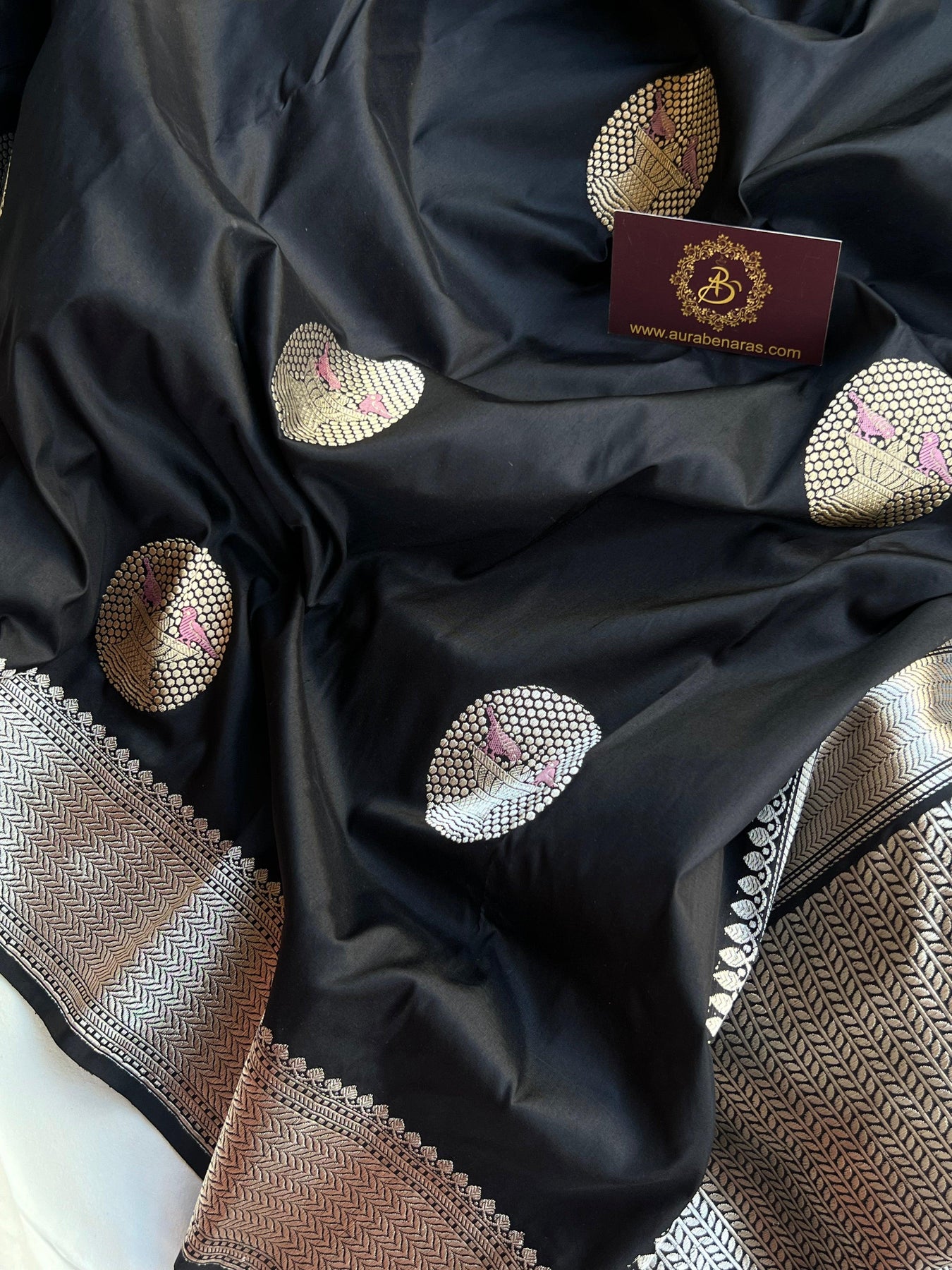 A stunning Black color Banarasi handloom classic with kadhua(kadwa) buta work. The authentic Kadhwa peacock motifs with meenakari work handwoven in the finest Katan silks,comes with a plain blouse. It takes around 10 days to weave this rich and luxurious piece of our tradition.