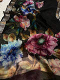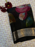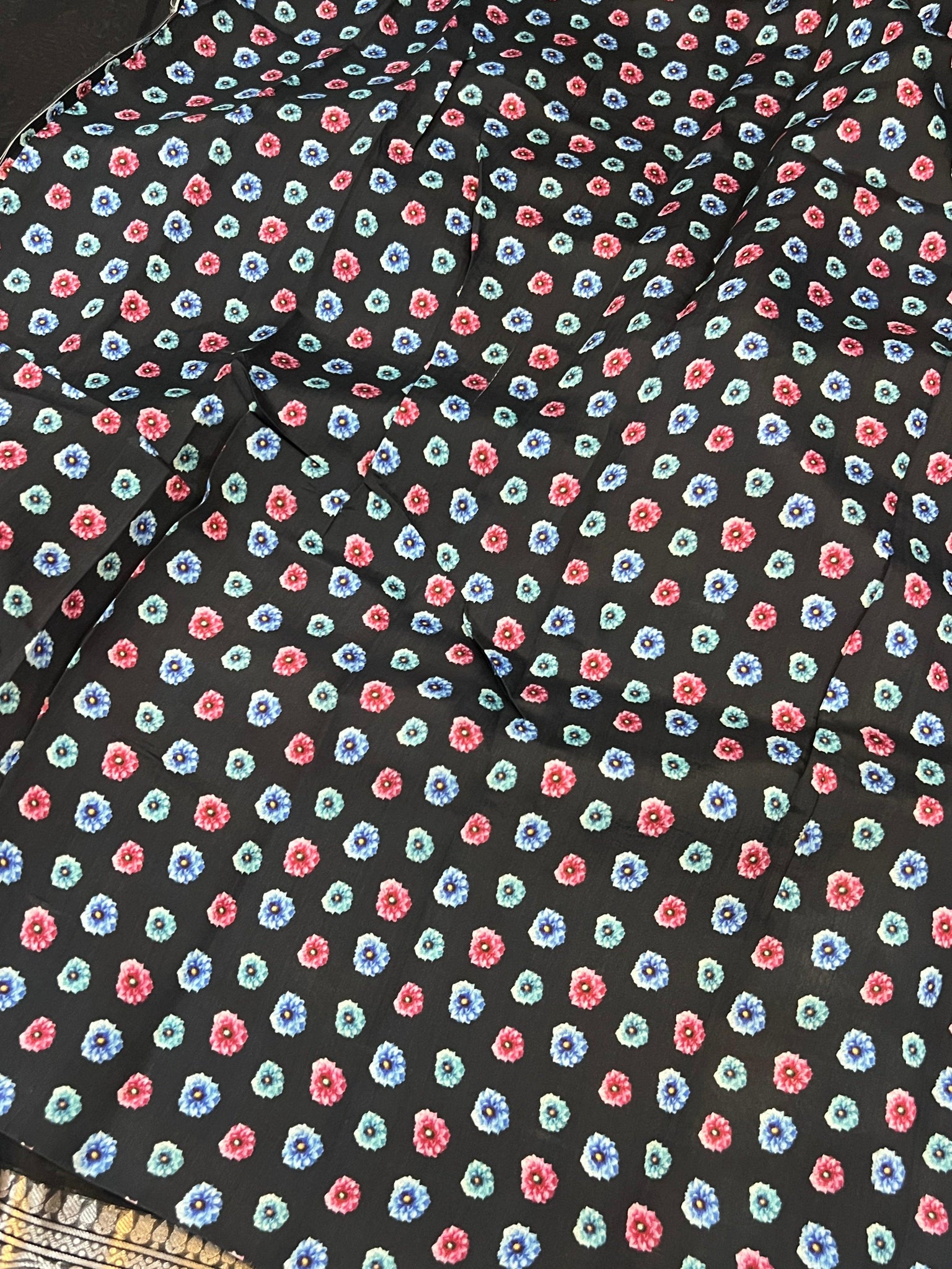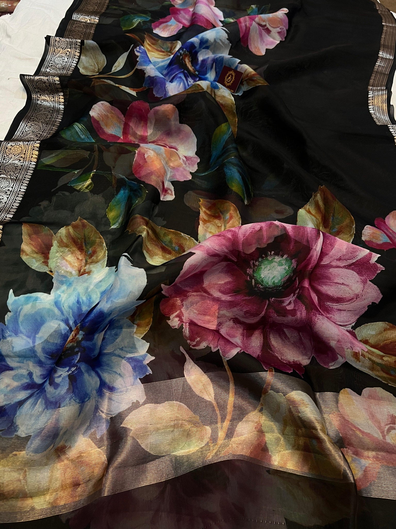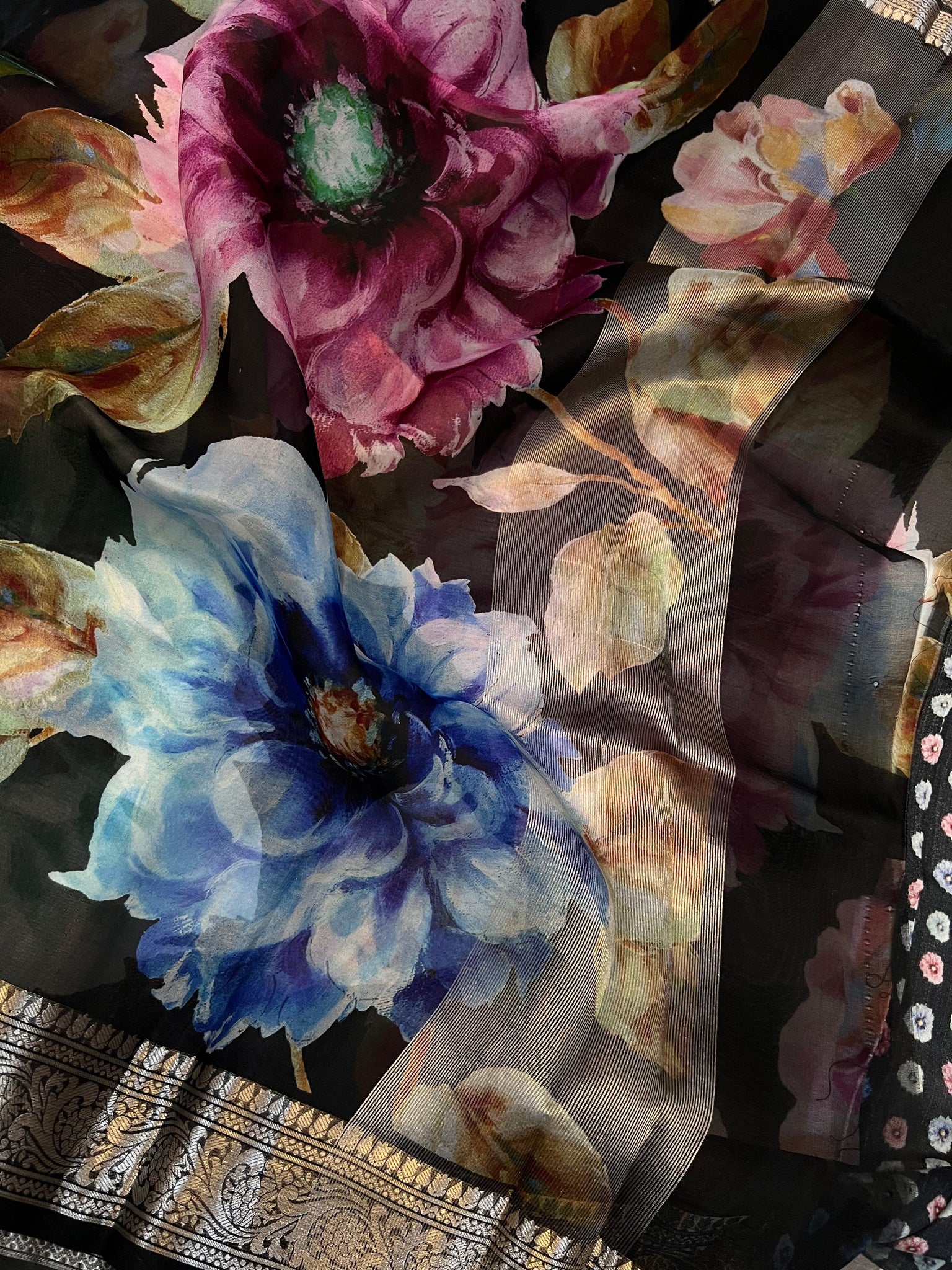 The saree’s Banarasi border is the highlight, offering a rich, traditional touch that perfectly balances the modern digital prints. The border is woven with the signature Banarasi craftsmanship, adding a regal, intricate detail that elevates the entire look. Its shimmering texture and elegant patterns enhance the saree's overall beauty, making it perfect for festive occasions or celebrations.