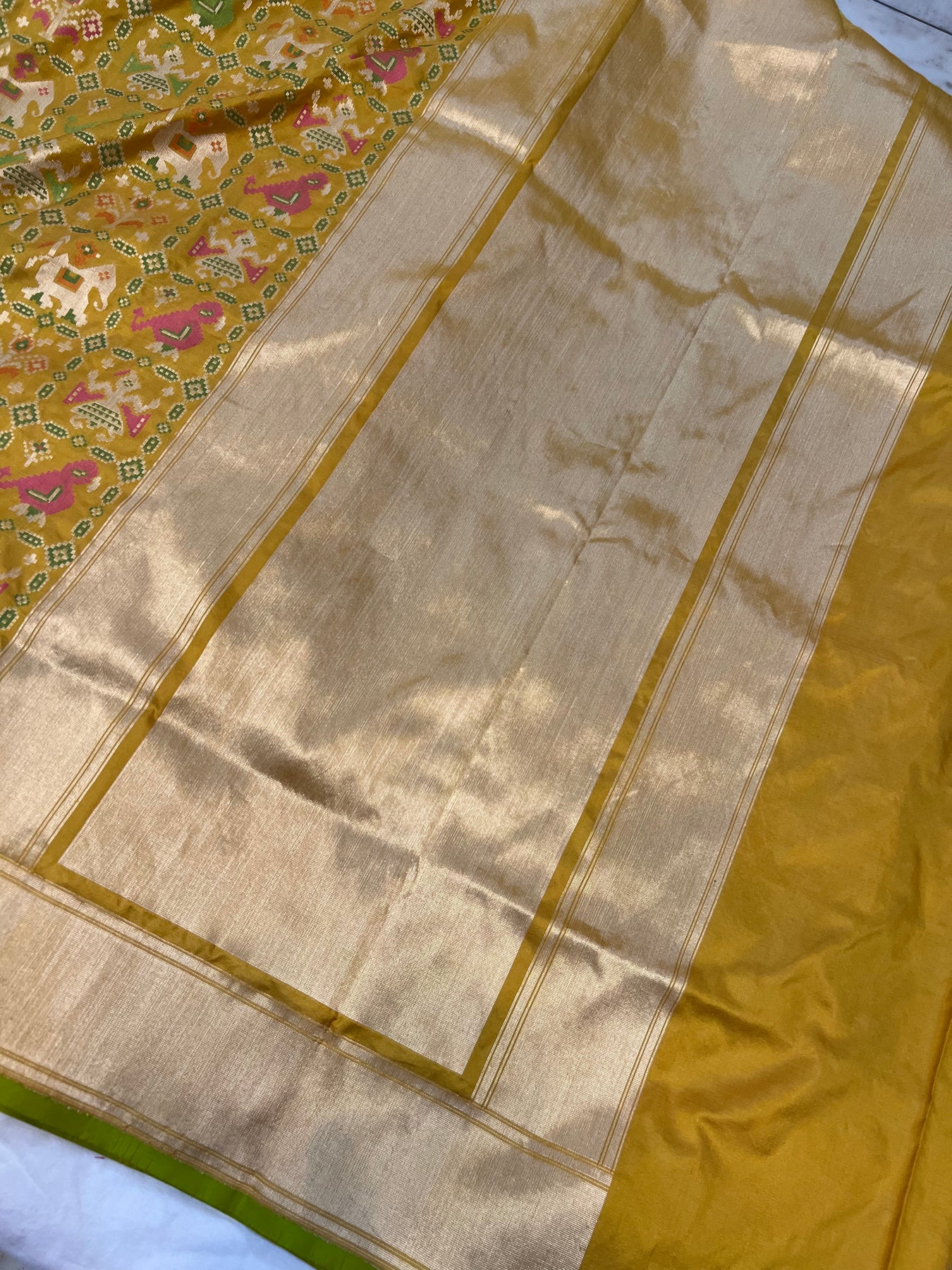 A stunning Mustard Yellow Banarasi handloom classic with meenakari work. The authentic tilfi Patola work with golden zari handwoven in the finest katan silks,comes with a plain blouse. It takes around 10 days to weave this rich and luxurious piece of our tradition.