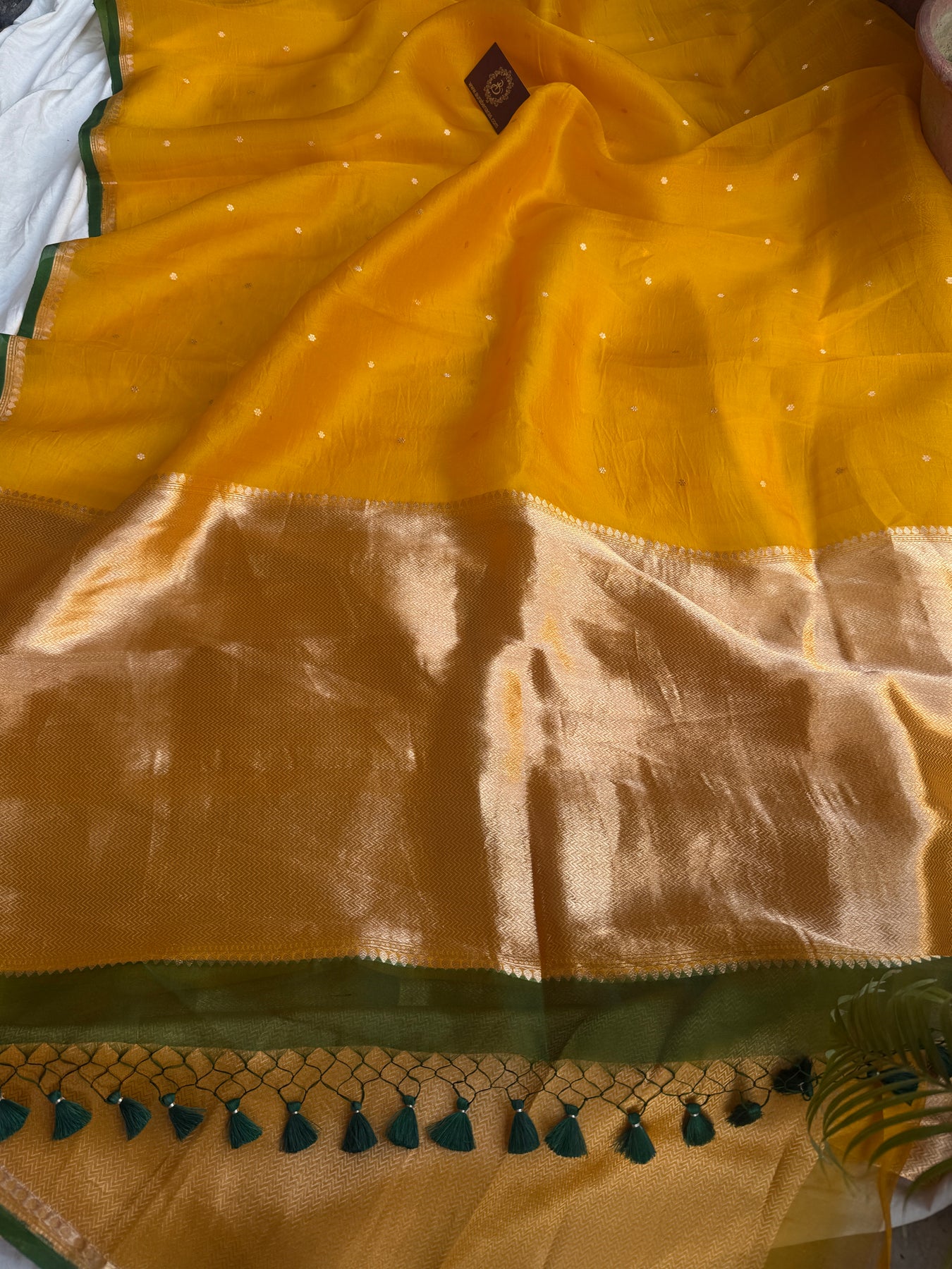 - Color - Mustard Yellow Banarasi saree with Bottle Green Piping.