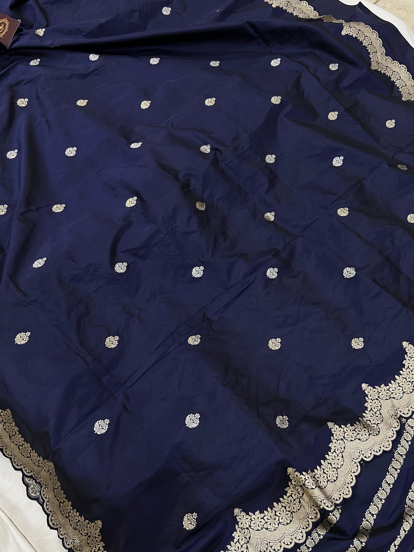 A stunning Navy Blue Banarasi handloom classic with kadhua buti work with designer scallop border. The authentic kadhua buti work in golden zari handwoven in the finest katan silks, comes with a heavy blouse. It takes around 20-25 days to weave this rich and luxurious piece of our tradition.
