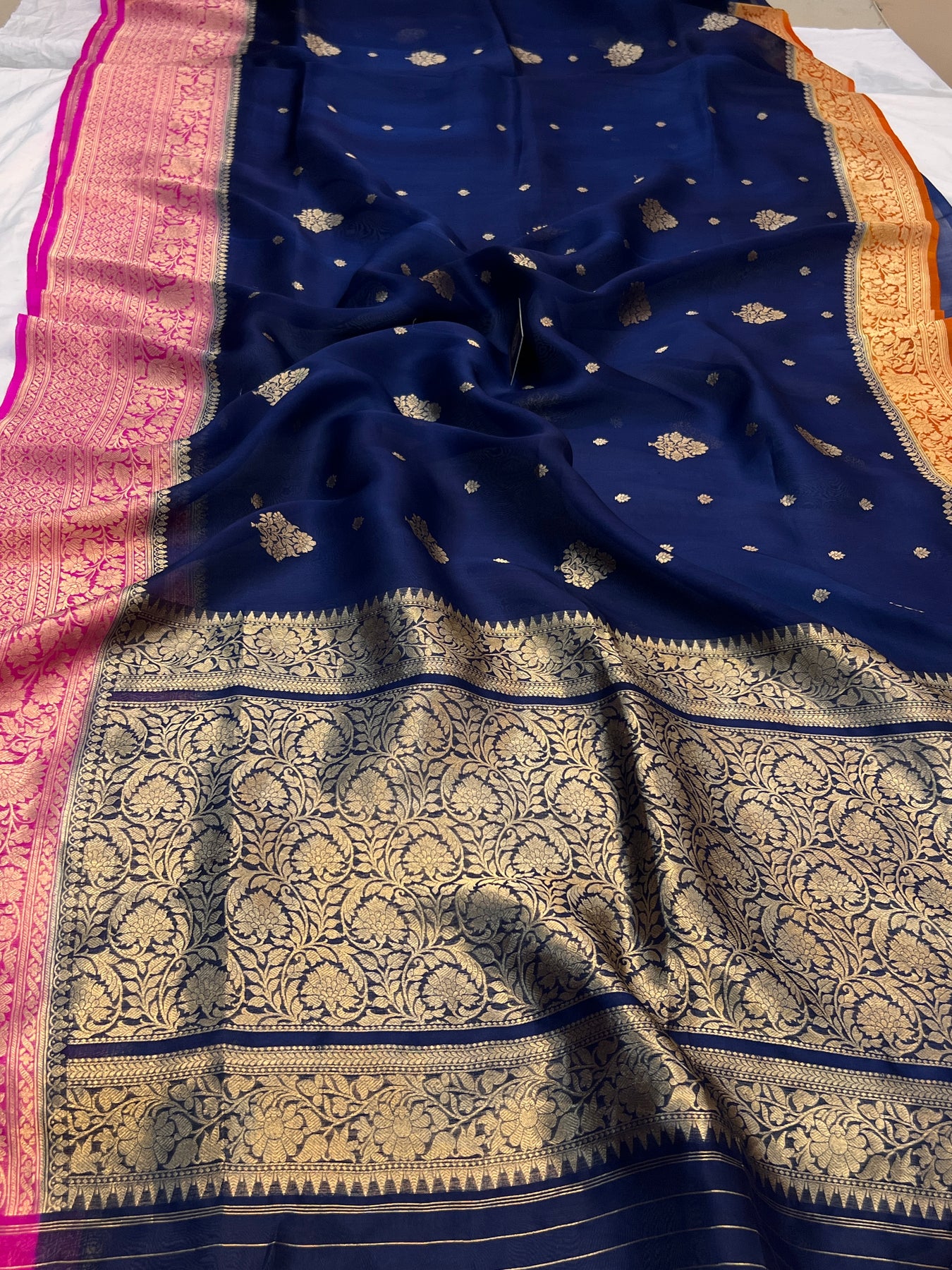 Navy Blue Banarasi Handloom Kora Silk Saree