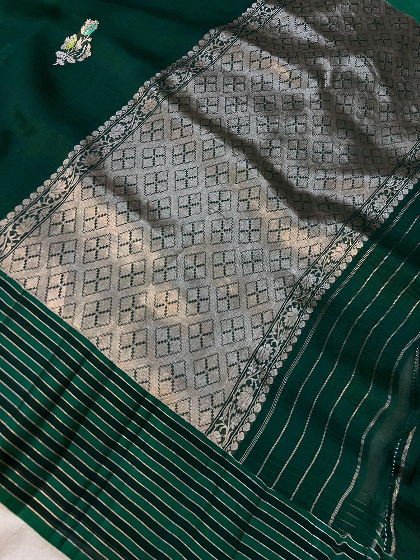 Pre Order :: Bottle Green Pure Banarasi Handloom Kora Silk Saree