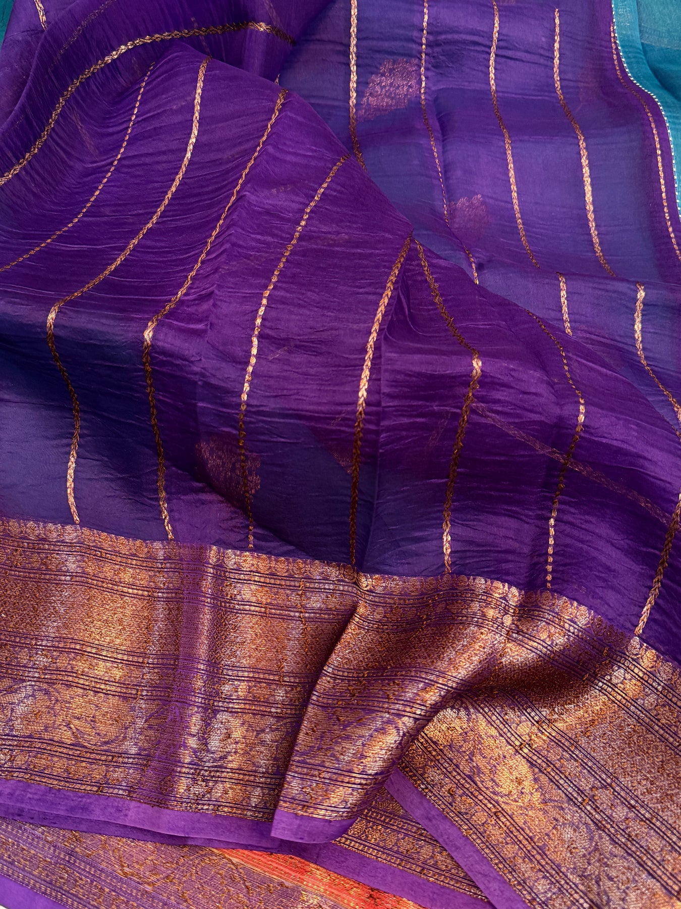 - Color - Rama Blue Banarasi saree with Red and Purple contrast.
