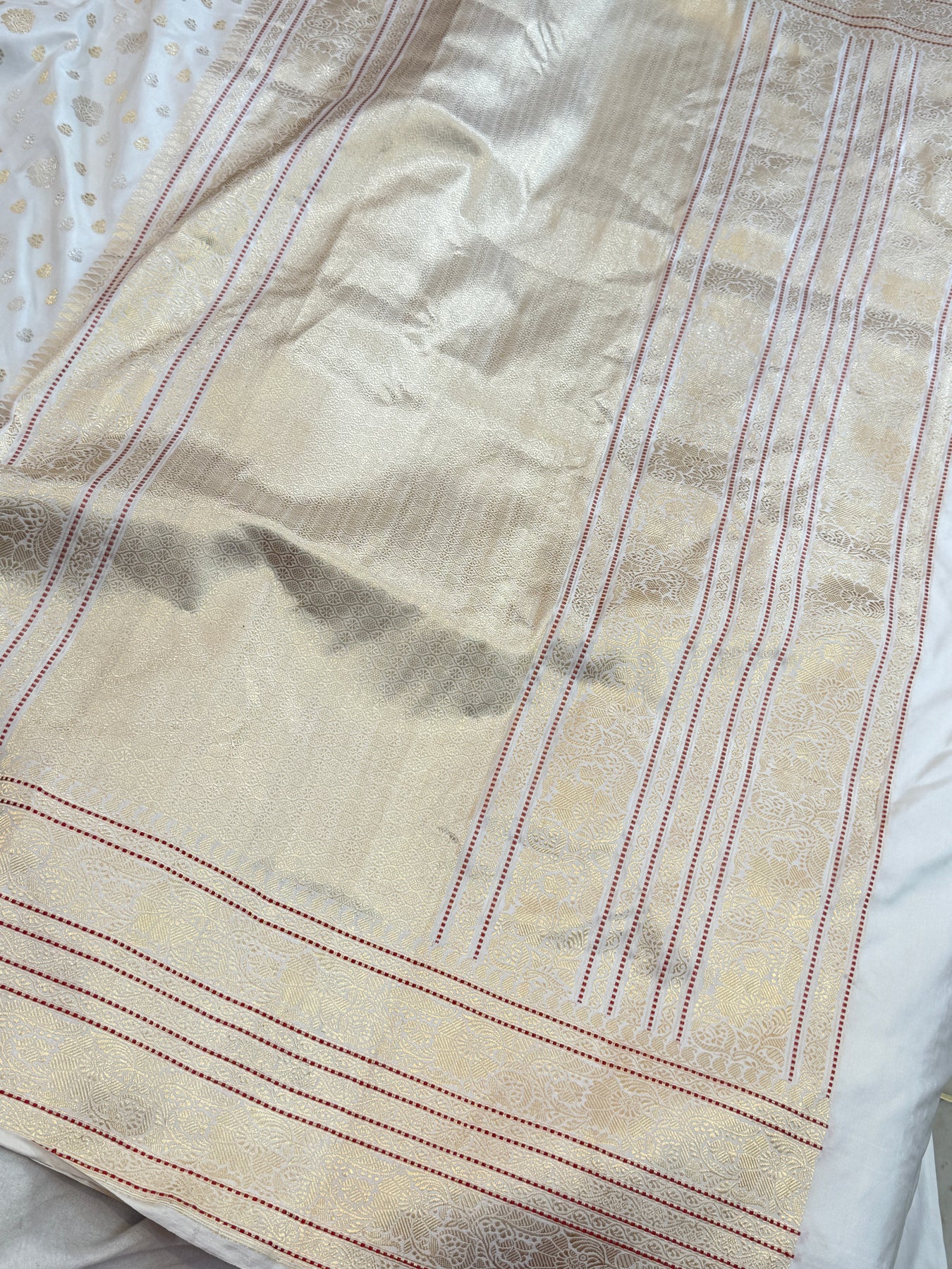 A pure White Banarasi handloom Katan silk saree with Kadhwa Sona Rupa Buta Buti design is a luxurious creation, showcasing intricate, handwoven motifs of buta and buti using gold and silver zari, creating a rich and regal look. The saree is crafted from the finest quality silk, offering a soft, premium feel. It features a traditional broad Banarasi border, enhancing its timeless elegance. The blouse piece is plain with a matching border, complementing the grandeur of the saree and adding a touch of understated sophistication.