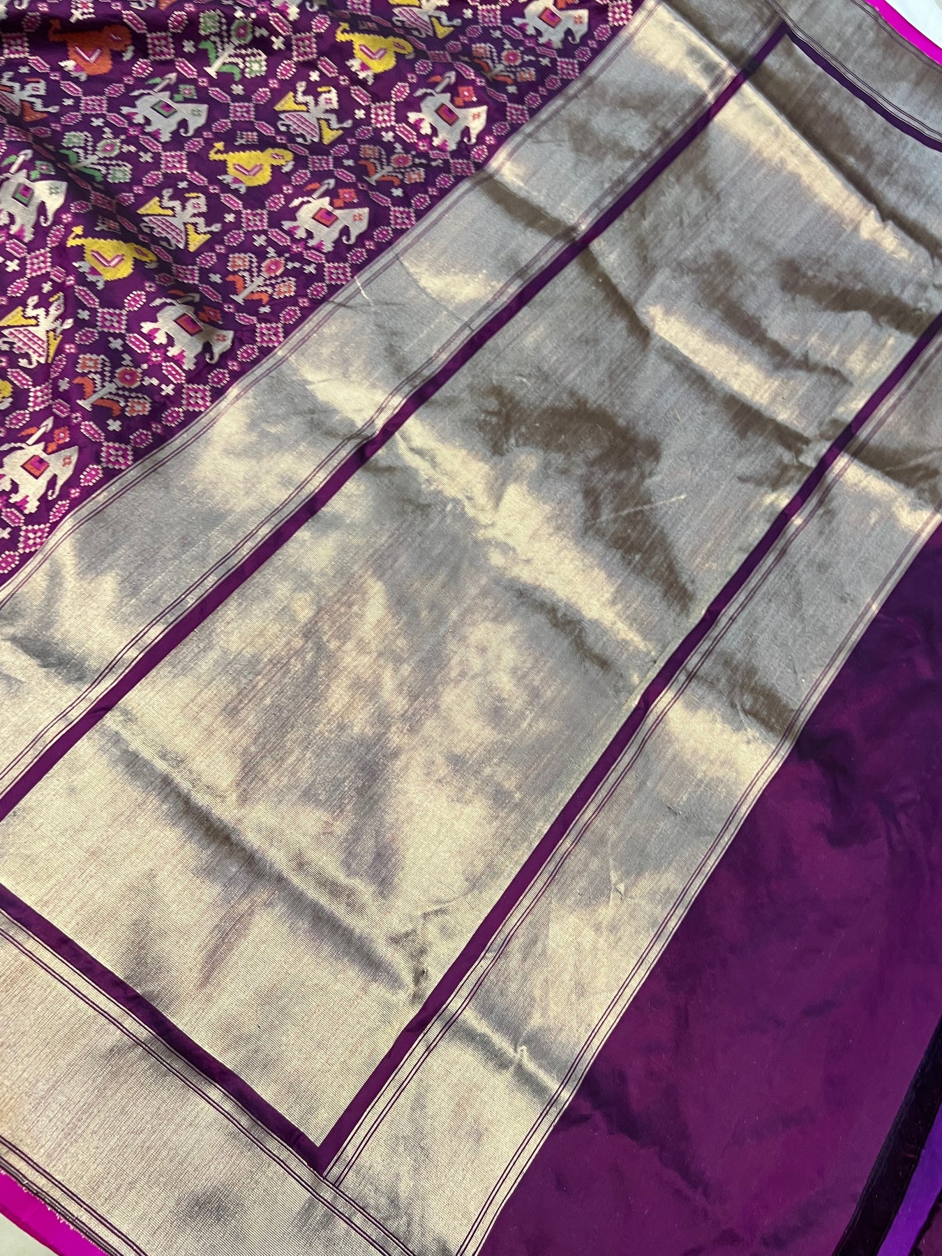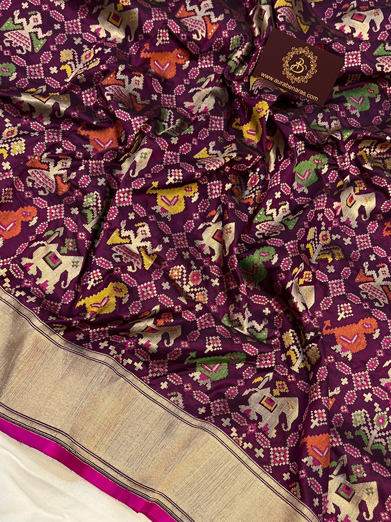 A stunning Wine Banarasi handloom classic with meenakari work. The authentic tilfi Patola work with golden zari handwoven in the finest katan silks,comes with a plain blouse. It takes around 10 days to weave this rich and luxurious piece of our tradition.